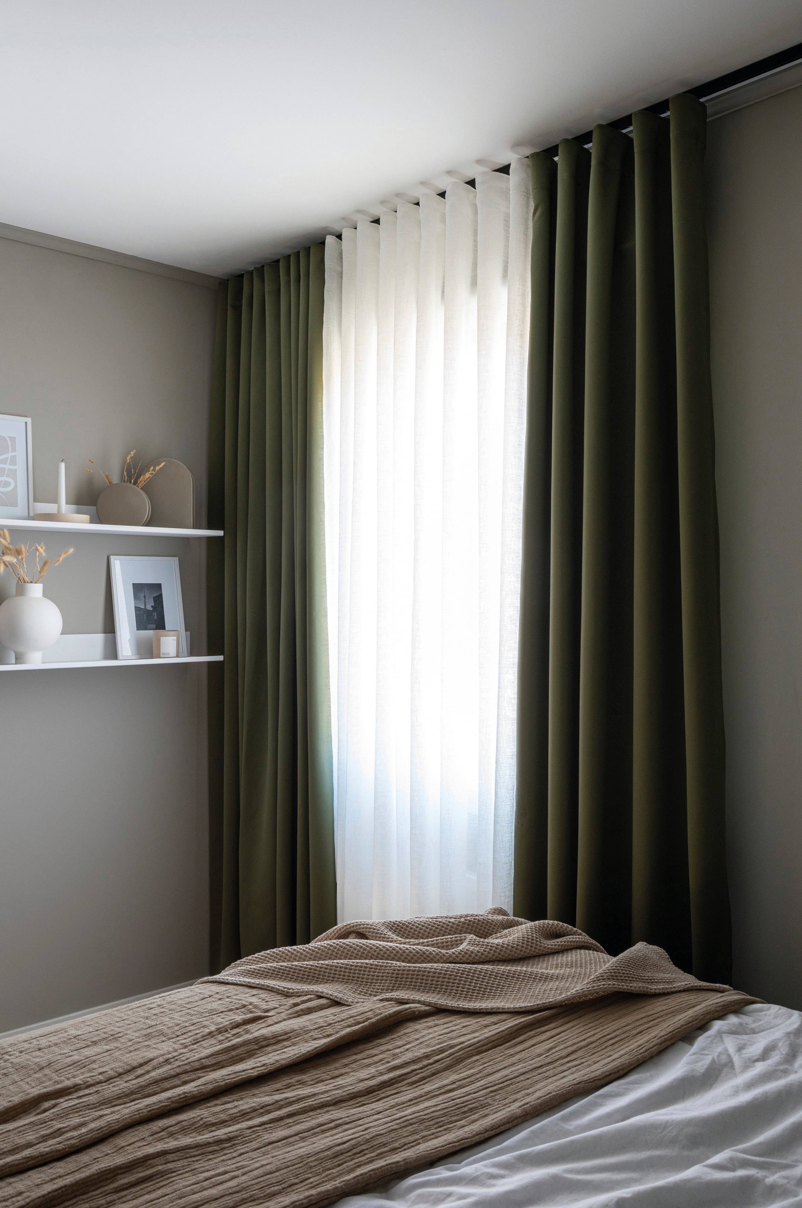 Gardin av tynt glanset materiale. Stoffets sanne glans blir ikke lagt merke til av bildet, i det minste i skyggen mineralgrå (som derfor er lysegrønn). De lange sidene av gardinen bl…