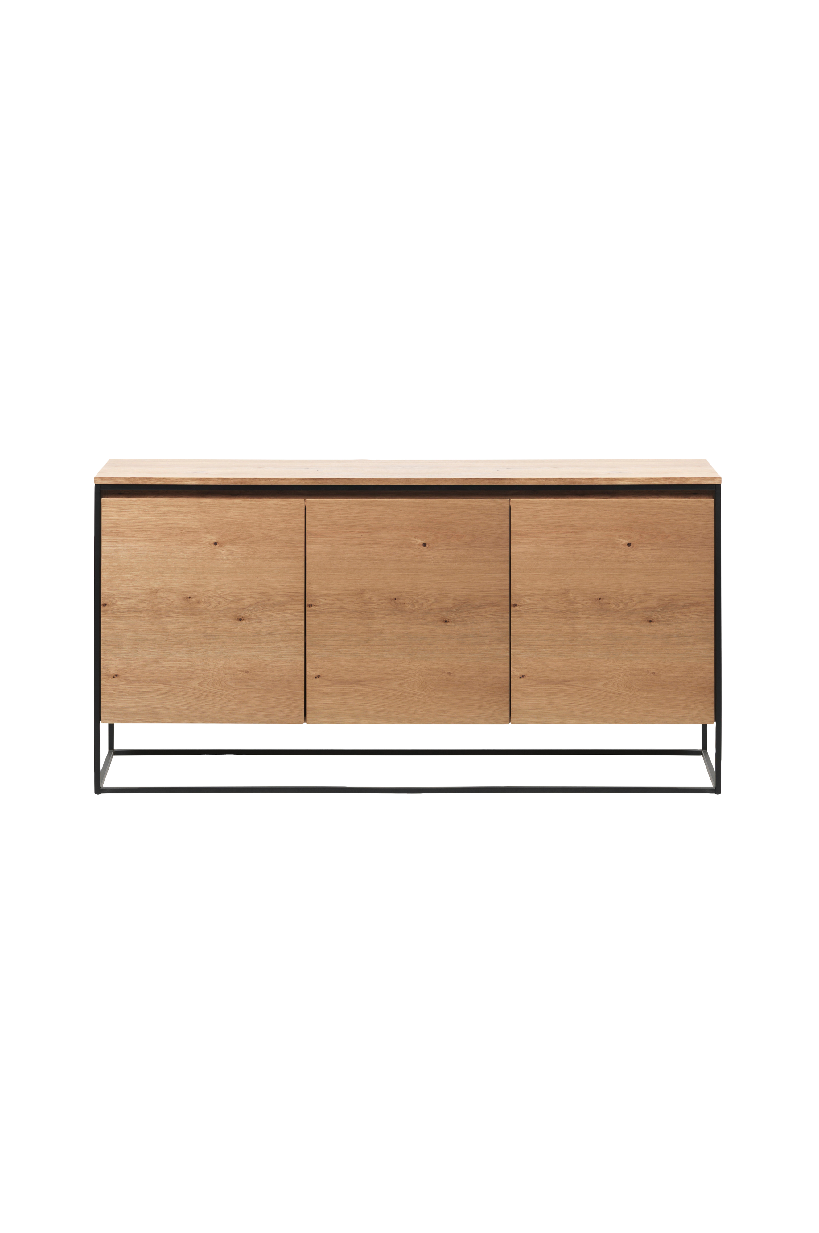 Firkantet, luftig, svart metallstamme i kontrast til mørk, røykfarget eikefinér som fremheves av lett børsting og med innebygde håndtak. Kolleksjonen Lindköping, i industristil med en minimalistisk, moderne silhuett, passer inn i ethvert kjøkken, stue eller spisestue.