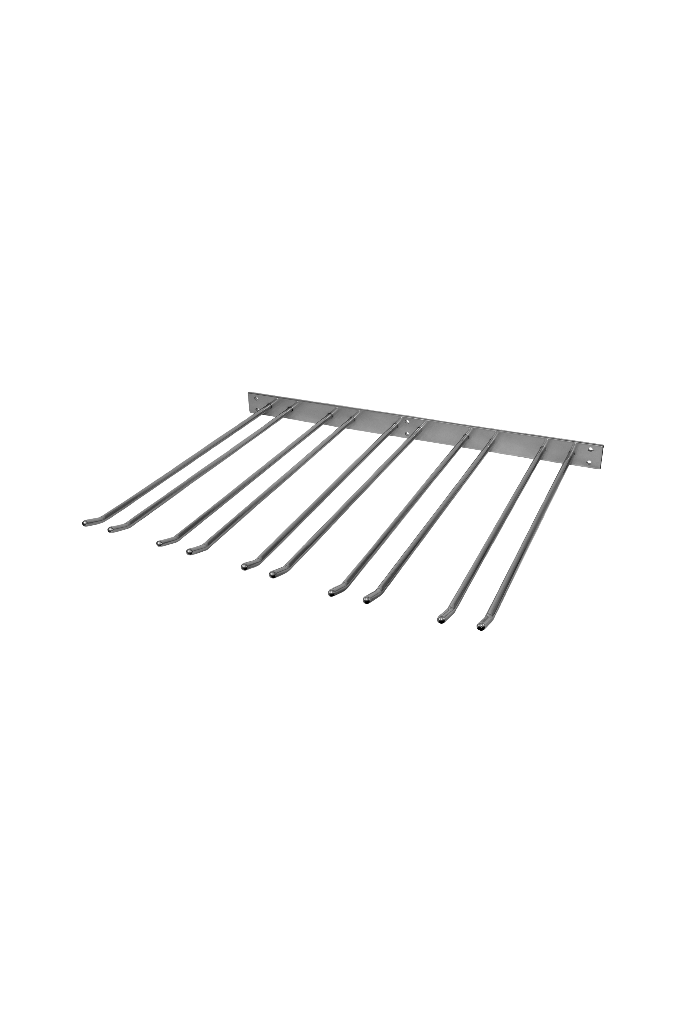 Forkrommet glassoppheng i barstil med fem rader for veggmontering, et elegant, forkrommet glassoppheng for veggmontering, 400 mm dypt og med plass til 20 glass. Bredde: 55 cm, total dybde inkludert plate: 42 cm, høyde: 4 cm.