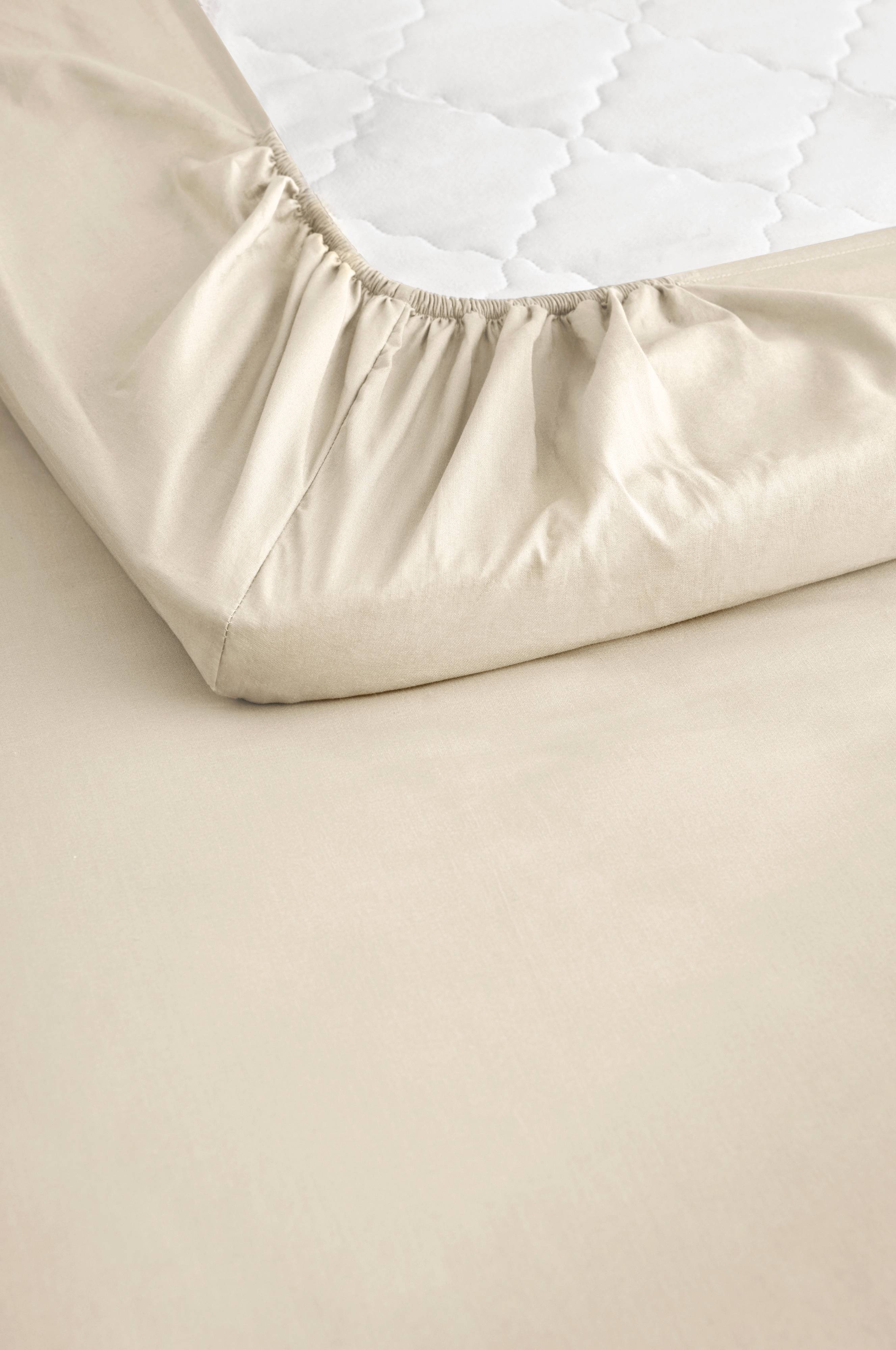 Dra på-laken i myk bomull. Trådtetthet 144 tc. Strikkbånd i hjørnene. Innbrett 25 cm. Passer madrasser opptil 10 cm.