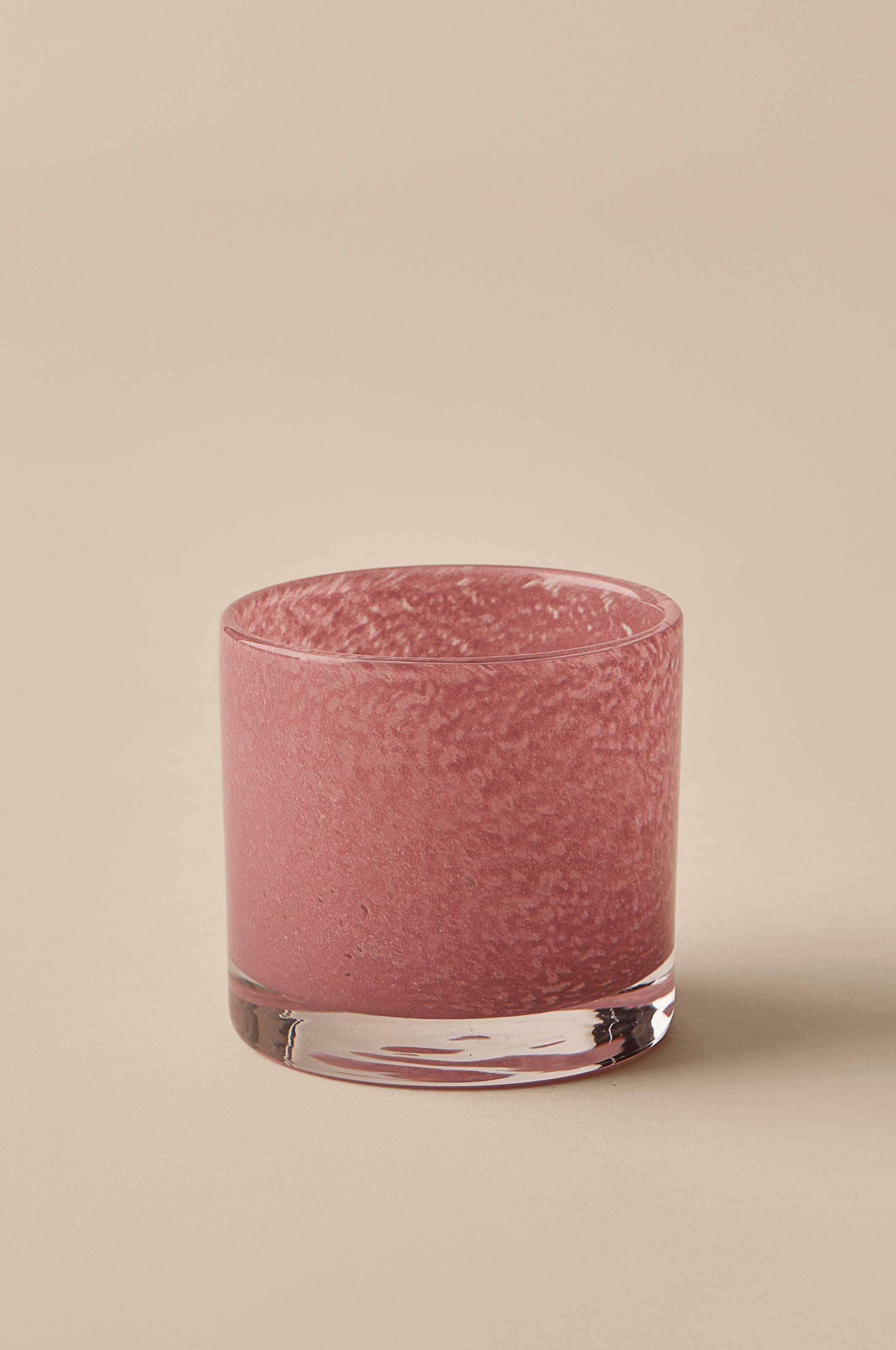 Lyslykt eller liten krukke i glass. Fargen har vakre skiftninger og glasset har bobler i seg som skaper et fint uttrykk og et stemningsfullt skinn. Teknikken gjør at ujevnheter og fargeforskjeller forekommer og hver lyslykt blir unik. Høyde ca. 10 cm, Ø ca. 10 cm. Rengjøres for hånd.