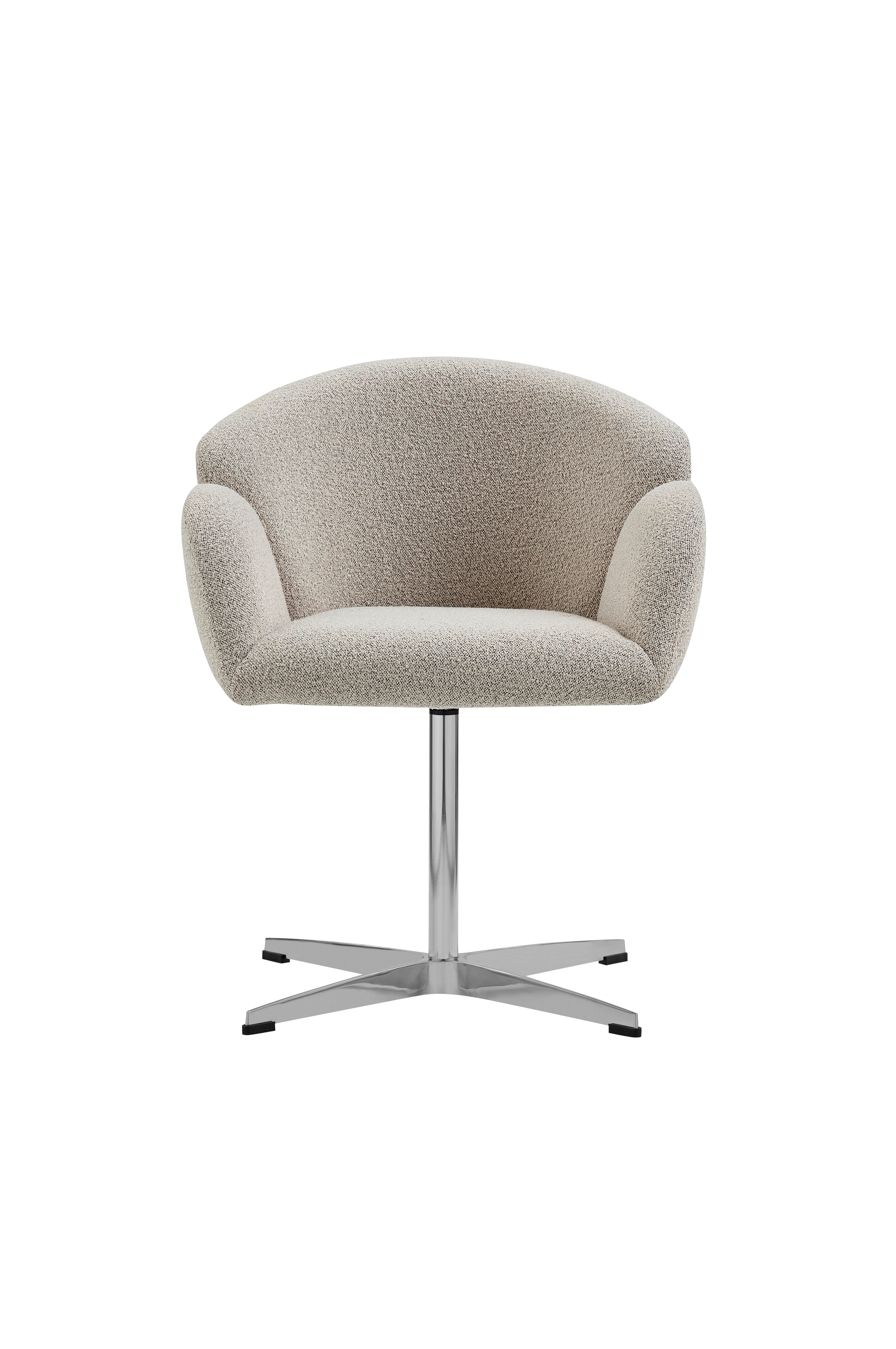 Stolen har et dreibart understell med en elegant metallfinish som gir stabilitet samtidig som det gjør det mulig å rotere jevnt. Det myke, strukturerte møbeltrekket utfyller den moderne silhuetten og skaper et sofistikert og innbydende møbel.