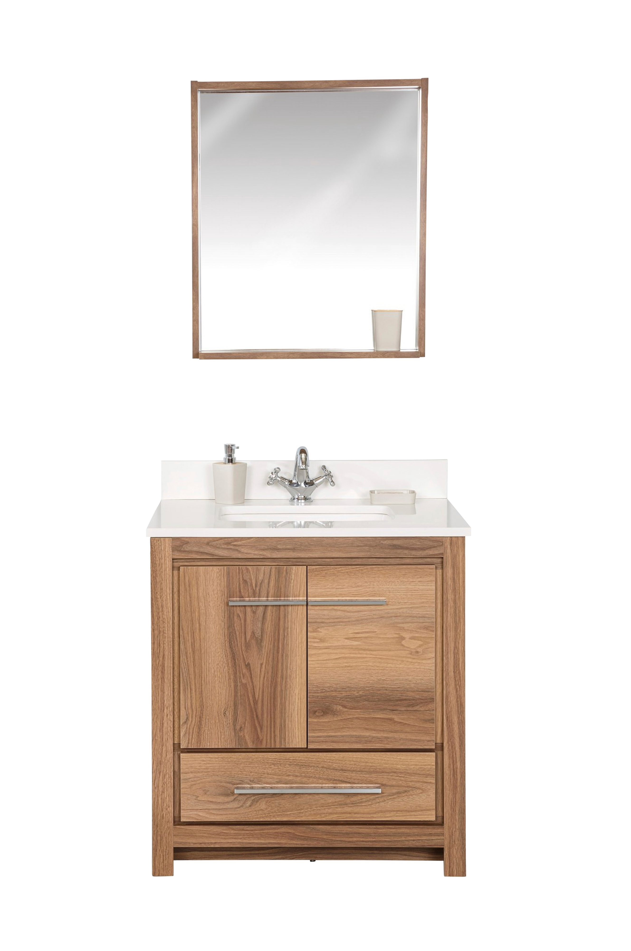 100% lakkert MDF (massivt tre) (tykkelse: 18 mm) benkeplate: 100% hvit kvarts & montert håndvask av porselen
