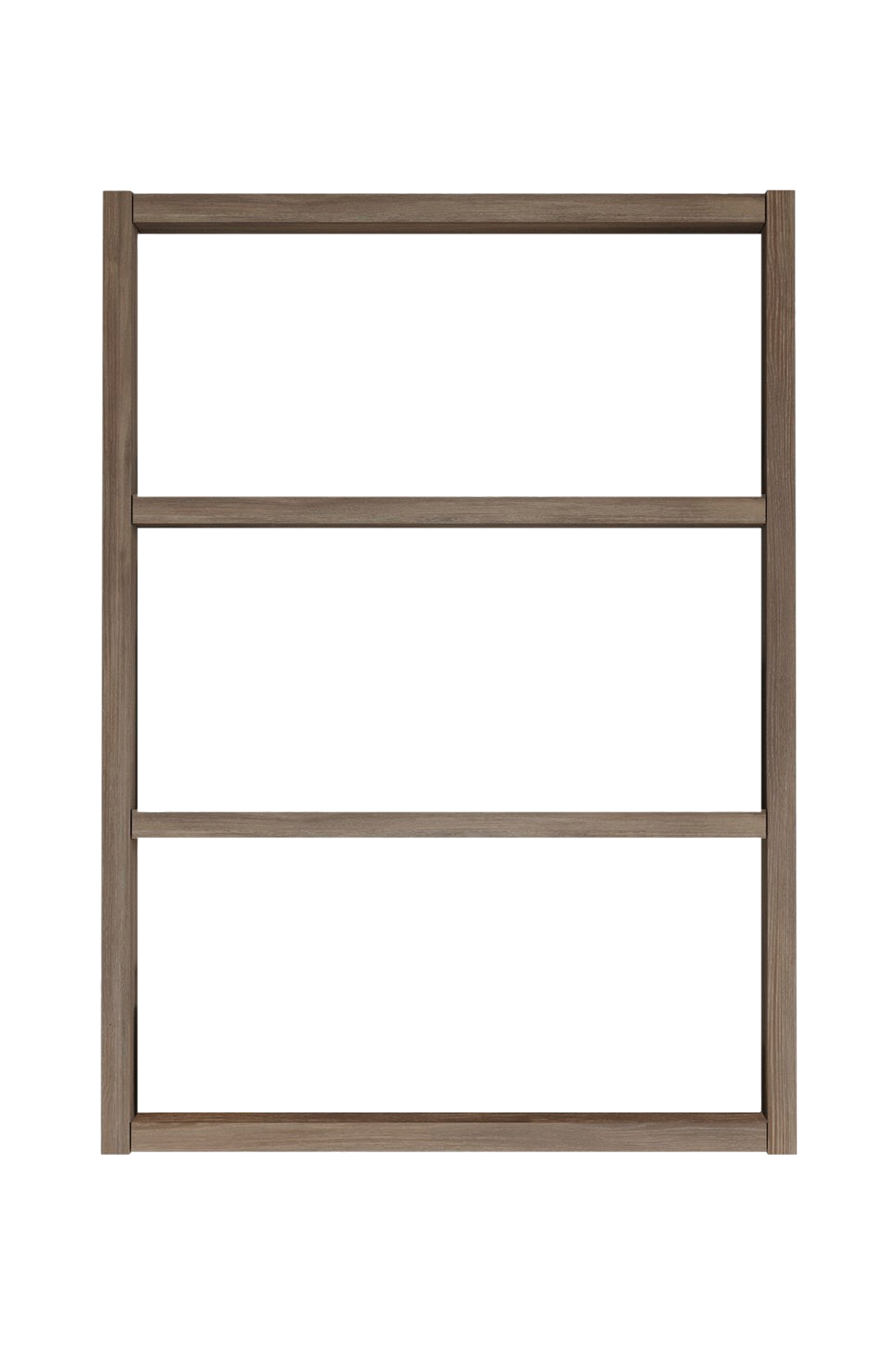 Hyllen har synlige metallskruer på sidene for hver hylle som ikke er vist på bildene. Skruehullene i selve hyllen er forboret ujevnt.