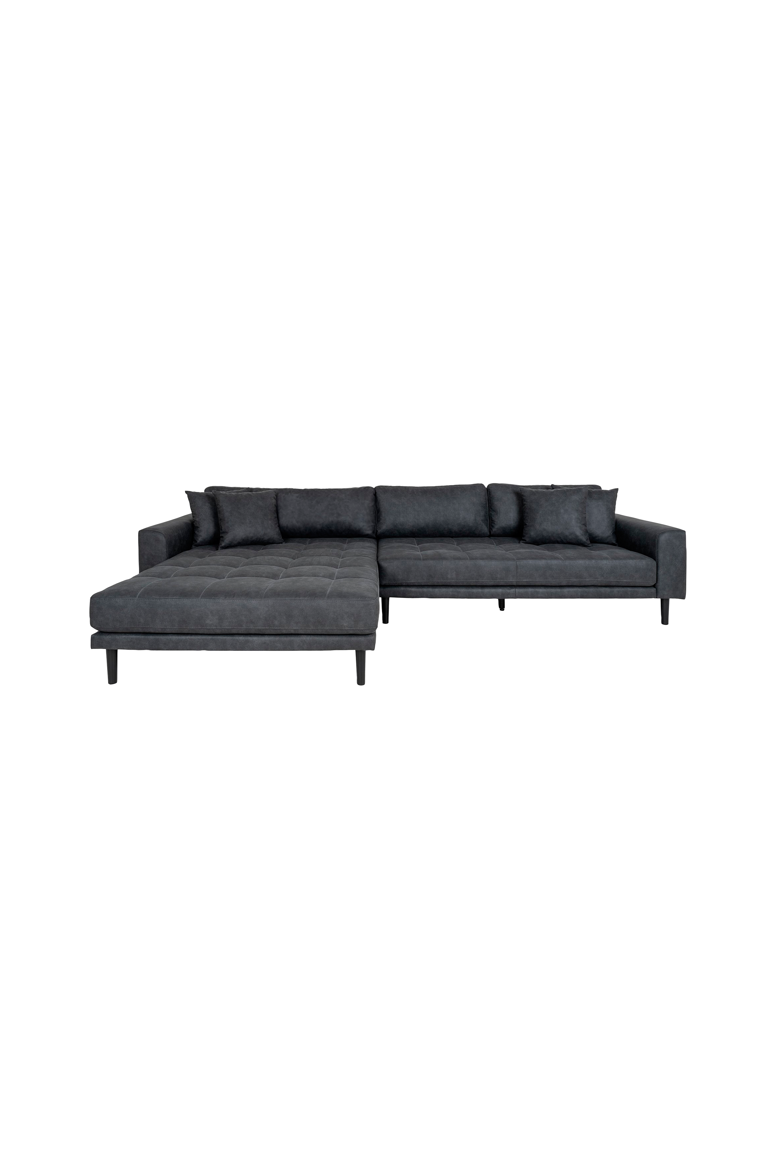 Loungesofa, venstrevendt, i mørkegrå mikrofiber med fire puter og ben i naturlig tre.