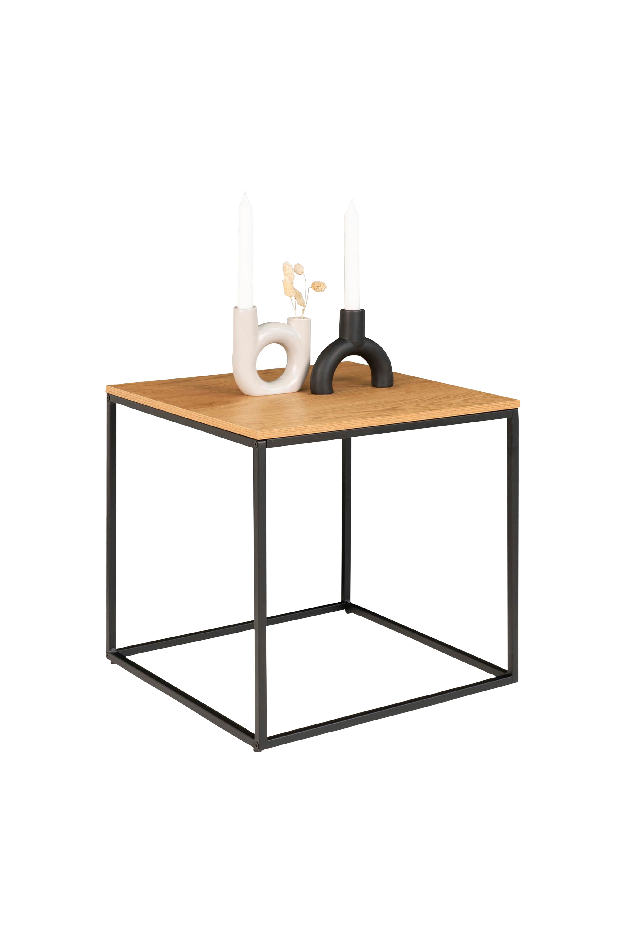 Sidebord av melaminbelagt sponplate med stålramme. Umontert. 45 x 45 x 45 cm. 3,4 kg
