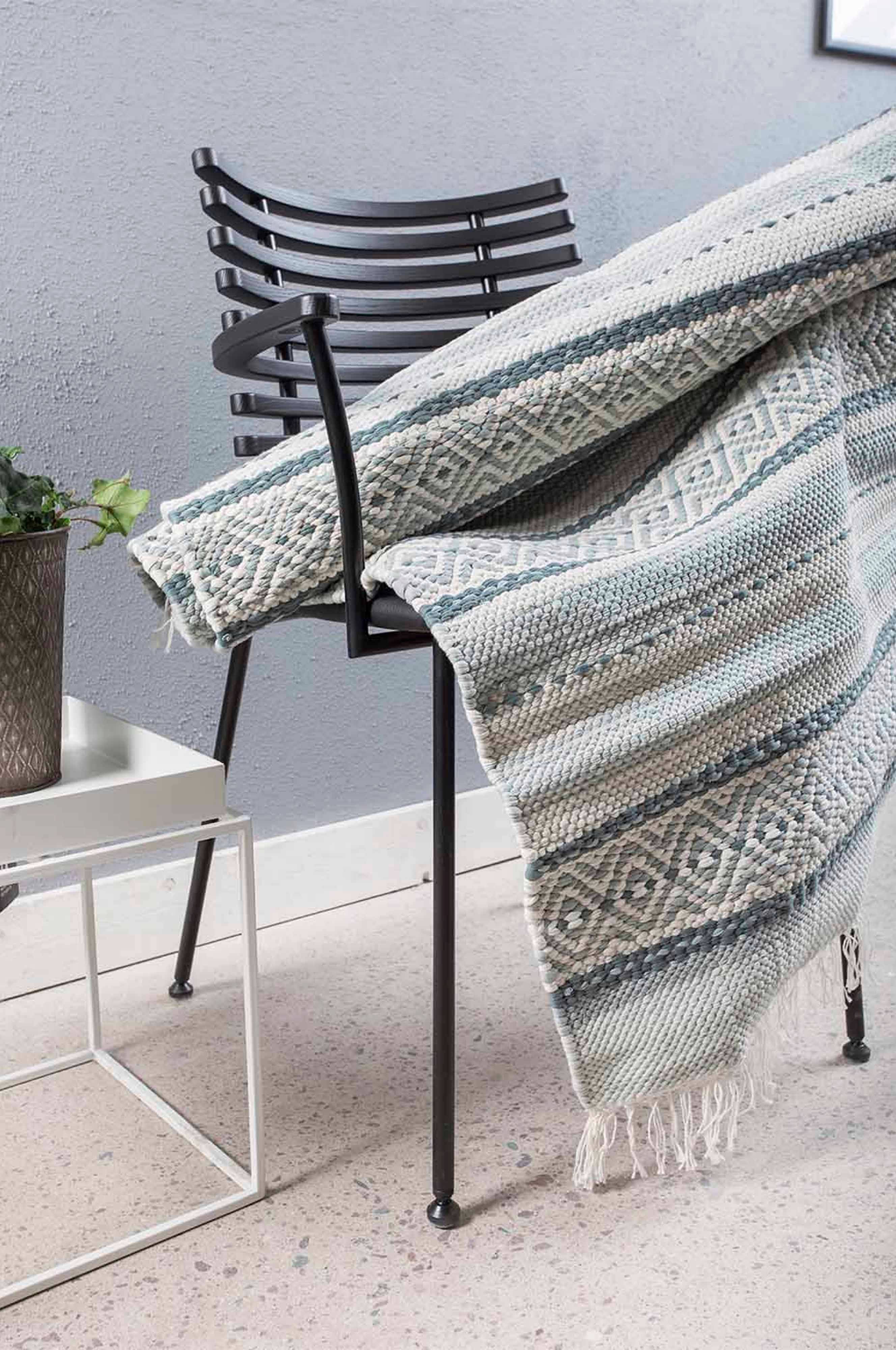 Fillerye av bomull i milde farger. Teppet er vevd i striper med innslag av «gåsøyemønster». Et teppe av høy kvalitet som har både et tradisjonelt og moderne uttrykk som passer mange interiørstiler.