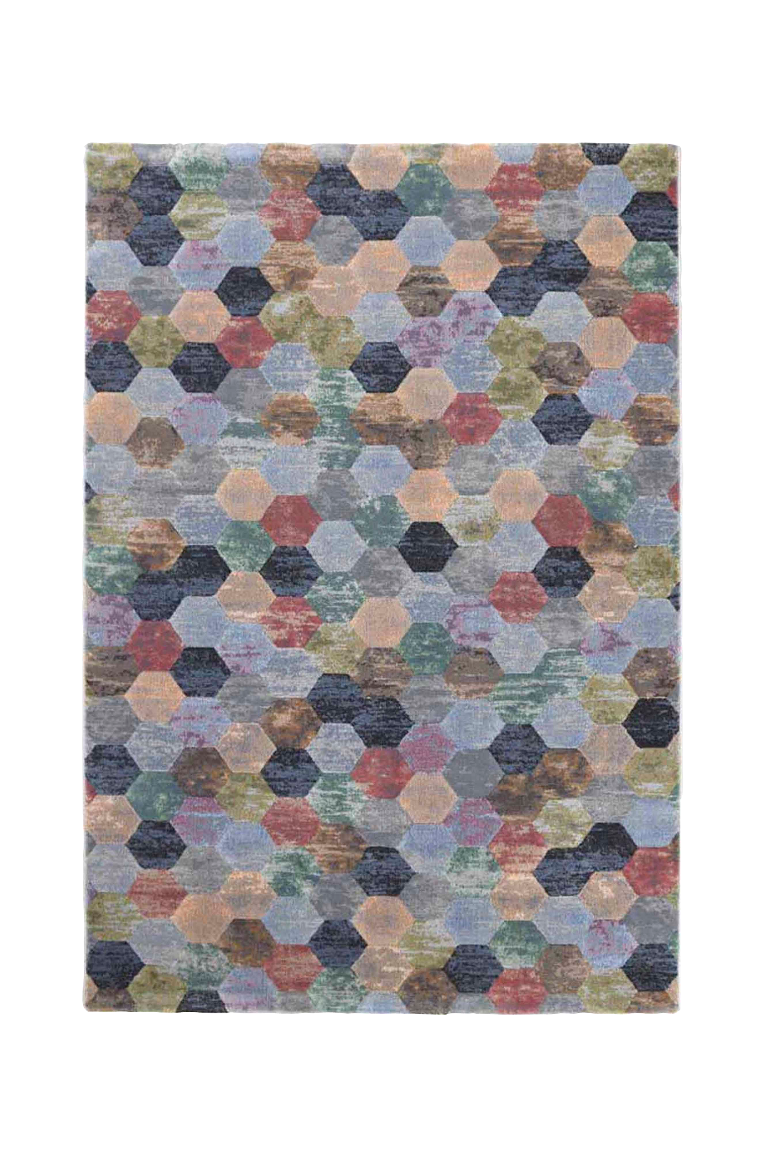 Herlig mykt og deilig Wiltonteppe av fin kvalitet med tett skåret lugg. Teppet har et vakkert sekskantmønster i fine farger. Et lettstelt teppe som gir farge til alt fra stue til soverom og spiseplass.