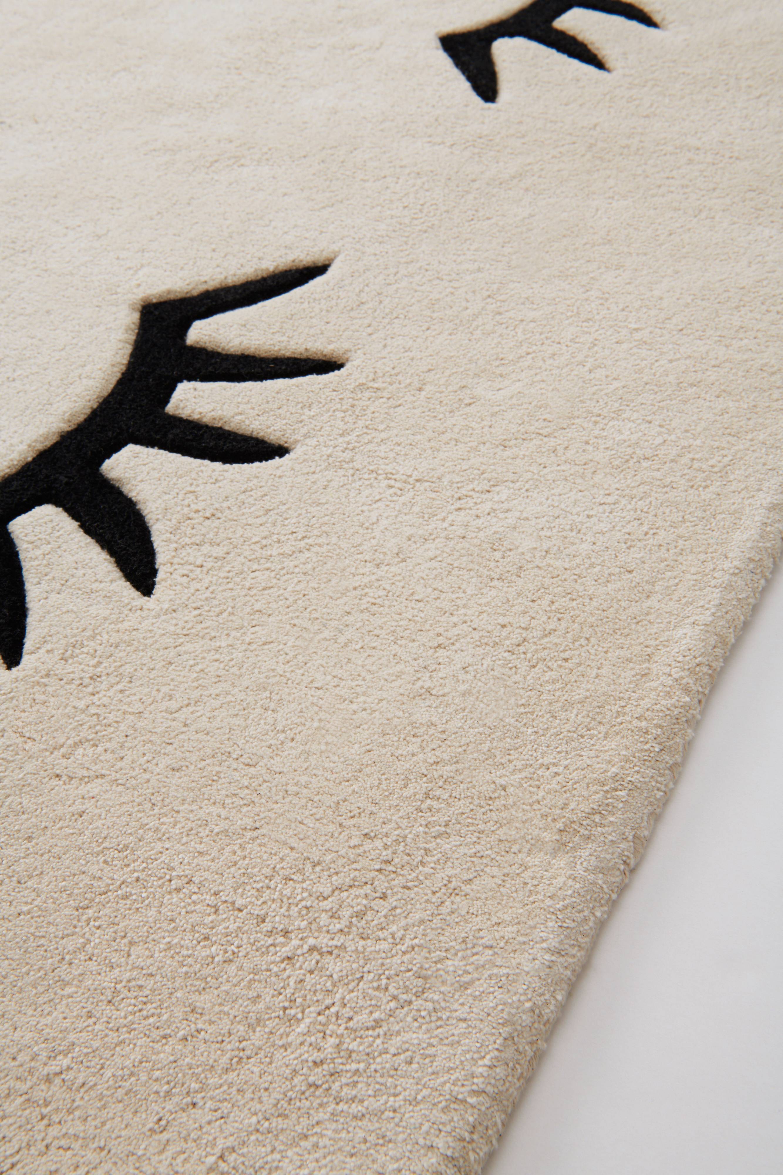 Håndtuftet barneteppe av myk, økologisk bomull med form av en sovende sky. En sovende sky ved siden av sengen på barnerommet kan gjøre det koselig å legge seg, og det er deilig å sette føttene på et varmt og mykt teppe når man våkner. Lugghøyde 1,2 cm. Tykkelse ca. 1,5-1,6 cm. 4000 g/m².