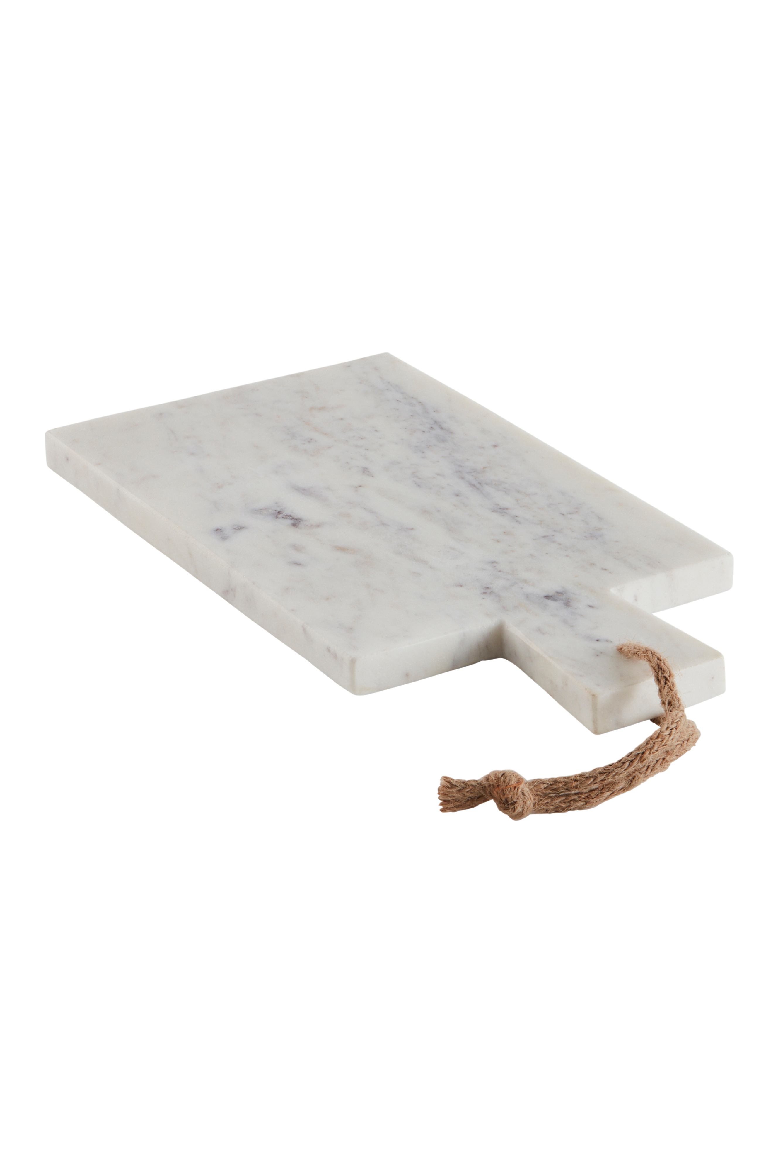 Rektangulær skjærefjøl av marmor med lite hull i håndtaket. Skjærefjølen er fint som serveringsfat. Den er også vakker å henge på veggen når den ikke er i bruk. Marmor er en naturstein, og mønsteret varierer alltid litt avhengig av bergartens sammensetning. Dette gjør hvert objekt unikt.