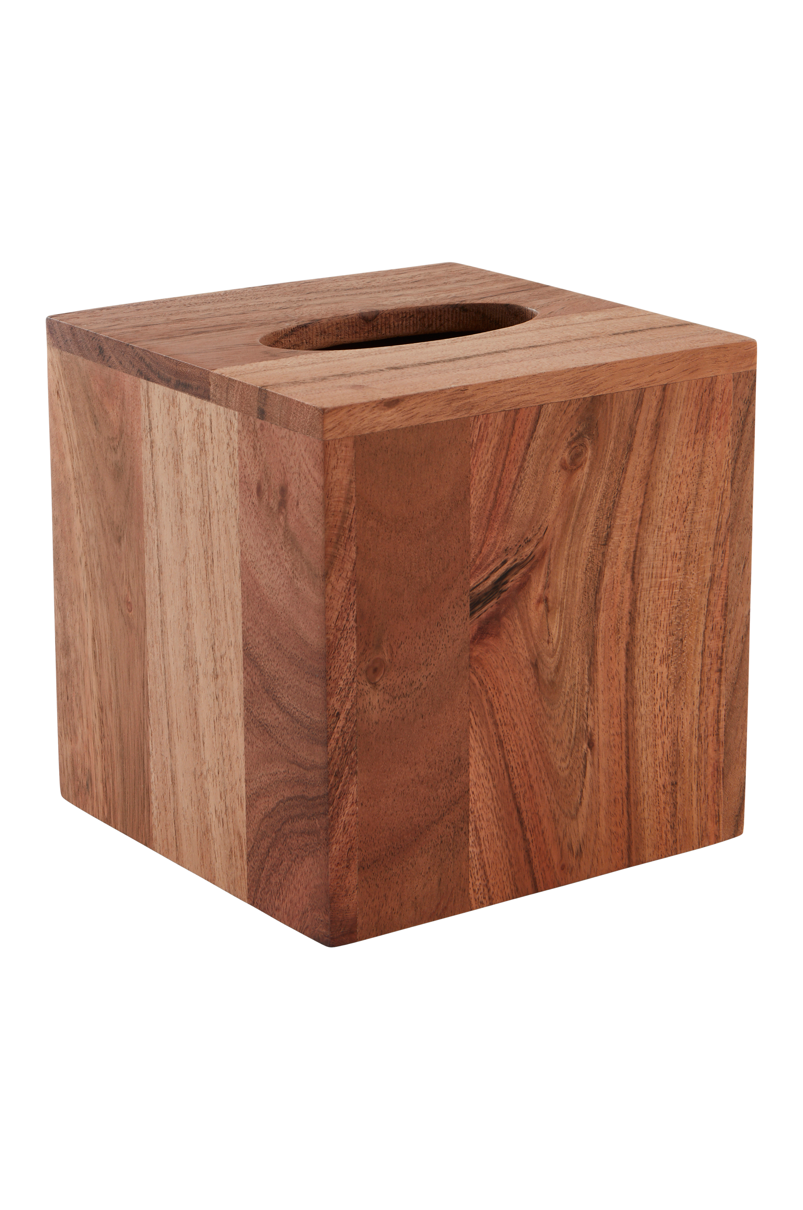 Firkantet serviettholder av akasie, et fint, dyrket treslag med lekker ådring og vakker, litt mørk trefarge. Serviettholderen har et ovalt hull øverst og mangler bunn, du plasserer den enkelt over bunken med papirservietter. Baderomsserien AKIKO kommer i flere deler som gjør badet koselig og pent.