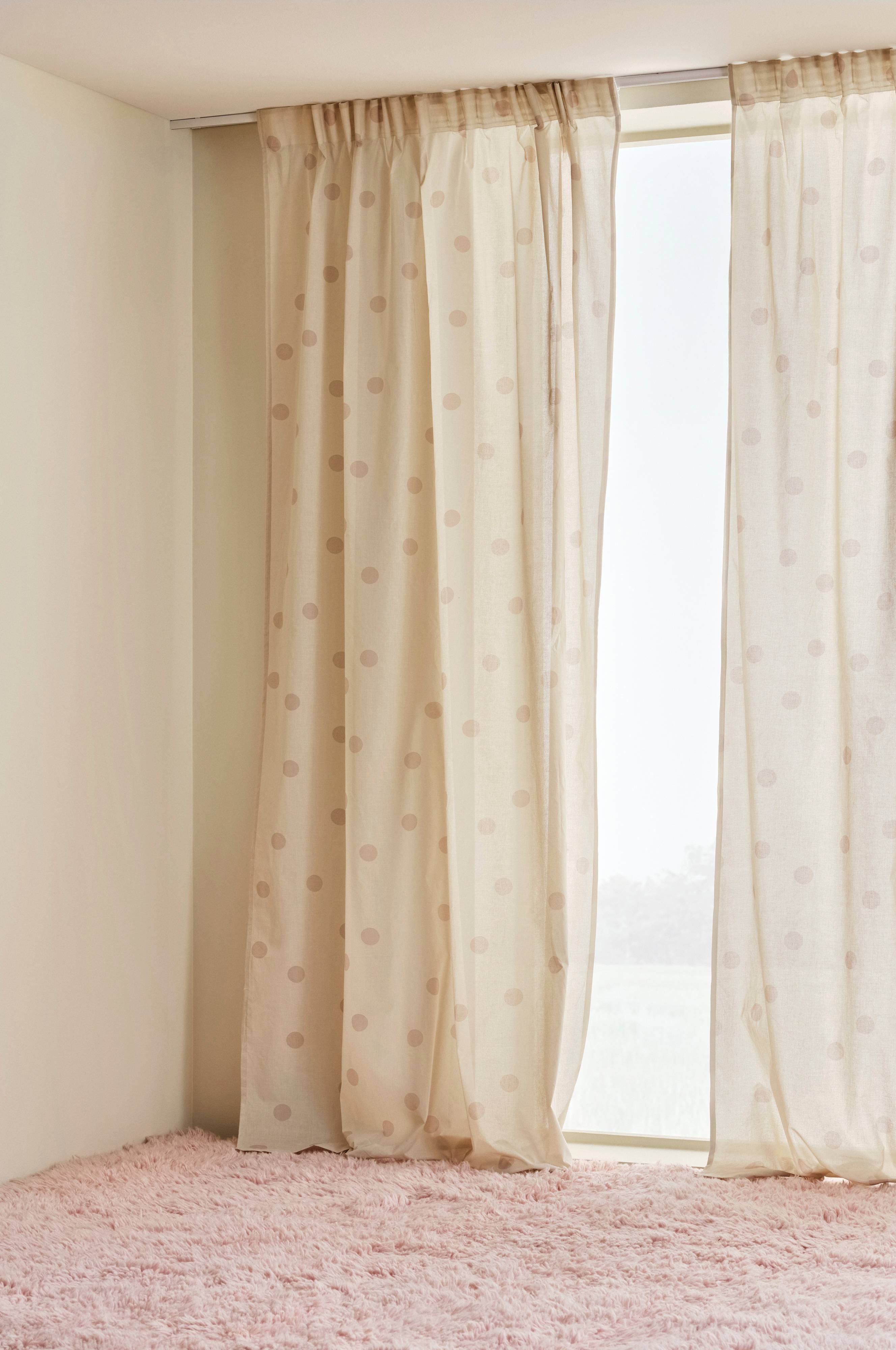 To gardinlengder i bomull med trykt prikkmønster ton-i-ton. Prikkete er mønsterbildet som aldri går av moten, en ekte klassiker. Lengdene har påsydd multifunksjonsbånd, og kan henges opp med fingerkroker, kanal samt skjult hempe.