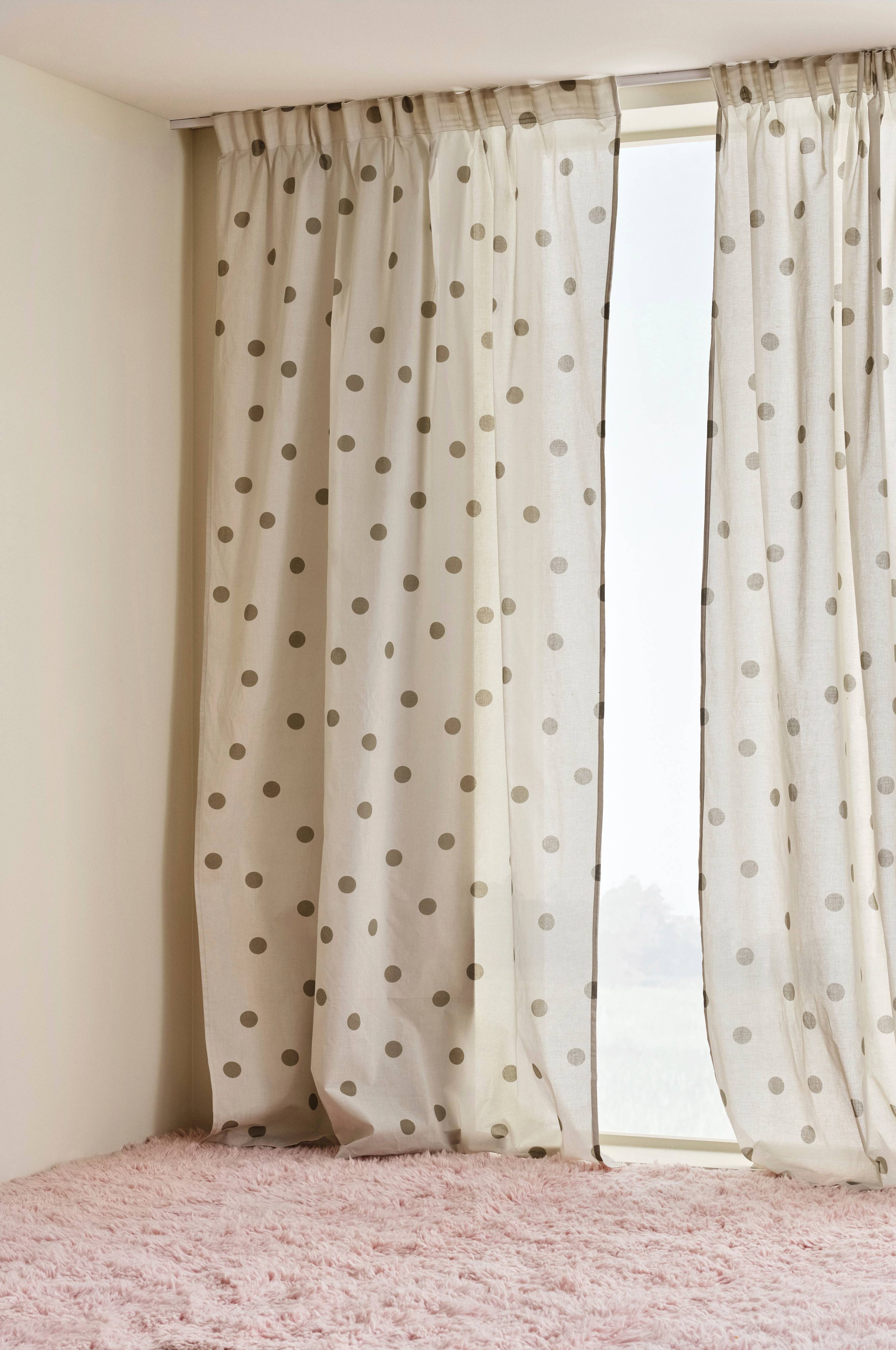 To gardinlengder i bomull med trykt prikkmønster ton-i-ton. Prikkete er mønsterbildet som aldri går av moten, en ekte klassiker. Lengdene har påsydd multifunksjonsbånd, og kan henges opp med fingerkroker, kanal samt skjult hempe.