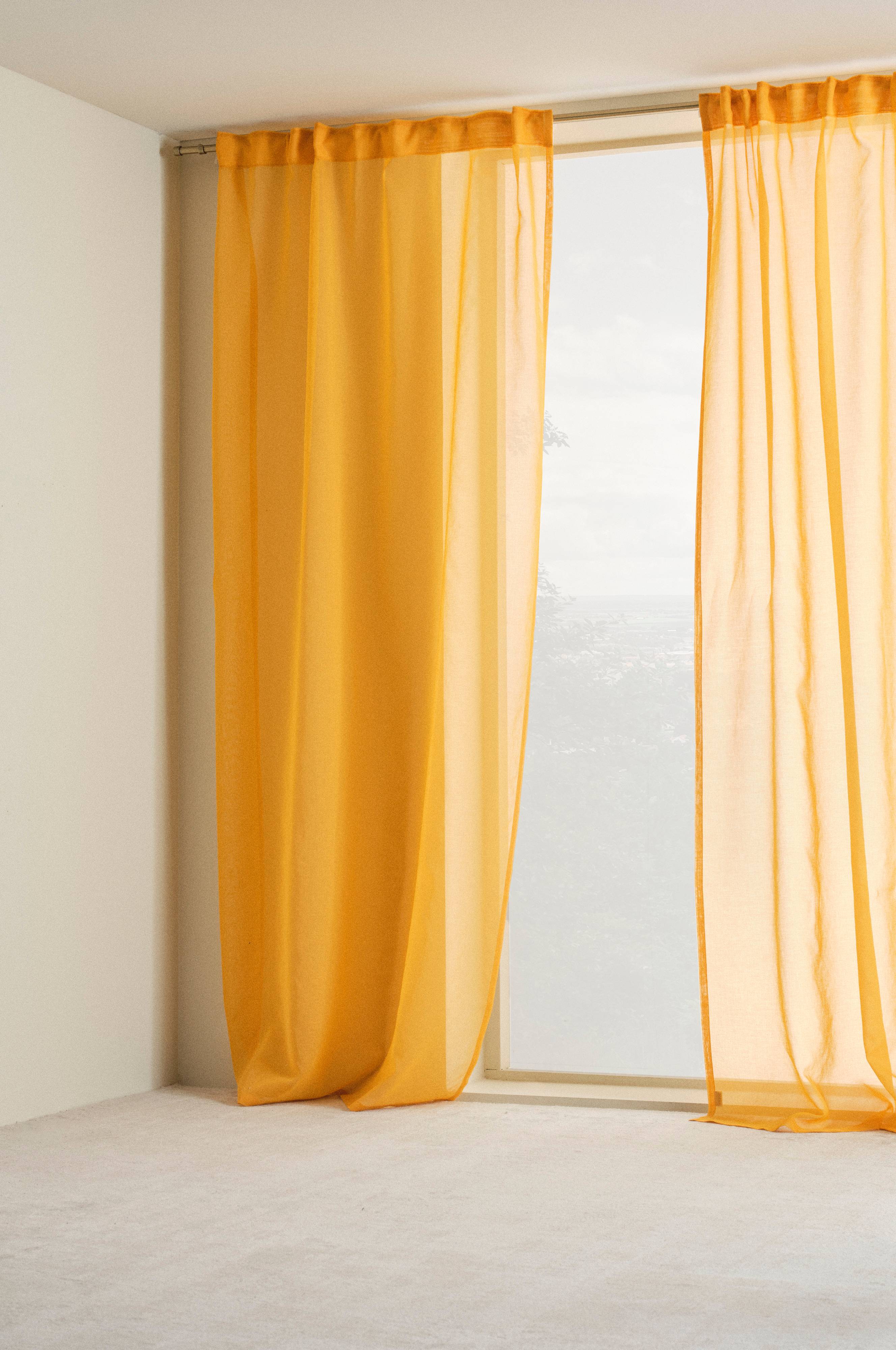 To gardinlengder i delikat og luftig voilepolyester som faller lett og gir mye lys. Hvis du ønsker å trekke gardinene for vinduet for å få litt privatliv, får du likevel det herlige lyset. Hvis de henger på siden av vinduet, tar de ikke like mye plass, men oppleves som penere. Materialet i gardinen er resirkulert.