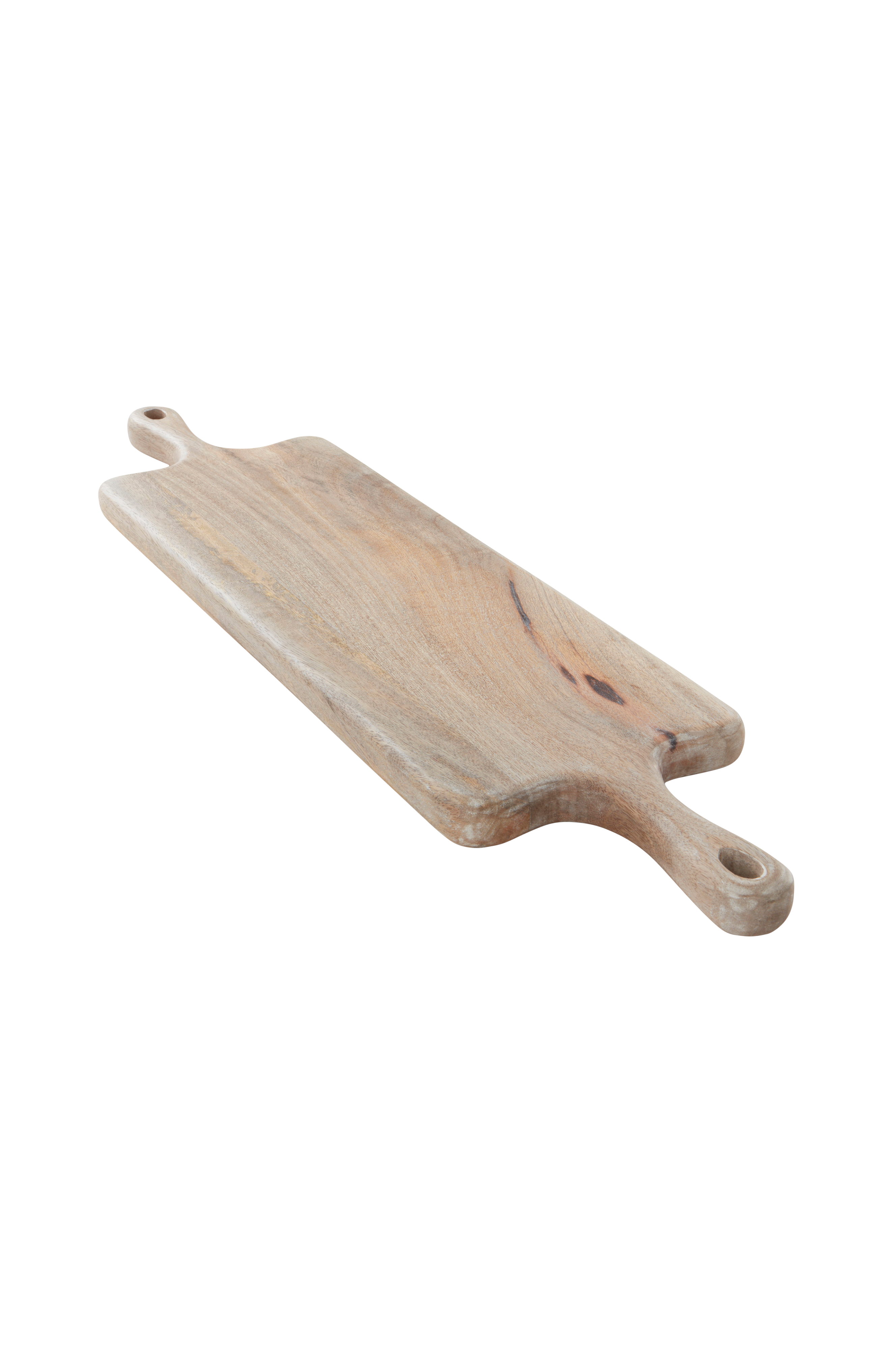 Skjærefjøl av FSC-sertifisert mangotre med vakker ådring. Skjærefjølen har hvitsåpet overflate som gjør den lys og fresh. Den spesielle formen med to håndtak gjør at den passer fint på middagsbordet med brød eller grønnsaker fint lagt opp. Skjærefjølen har behagelige avrundede kanter, og hver skjærefjøl er unik siden treet har naturlige variasjoner.