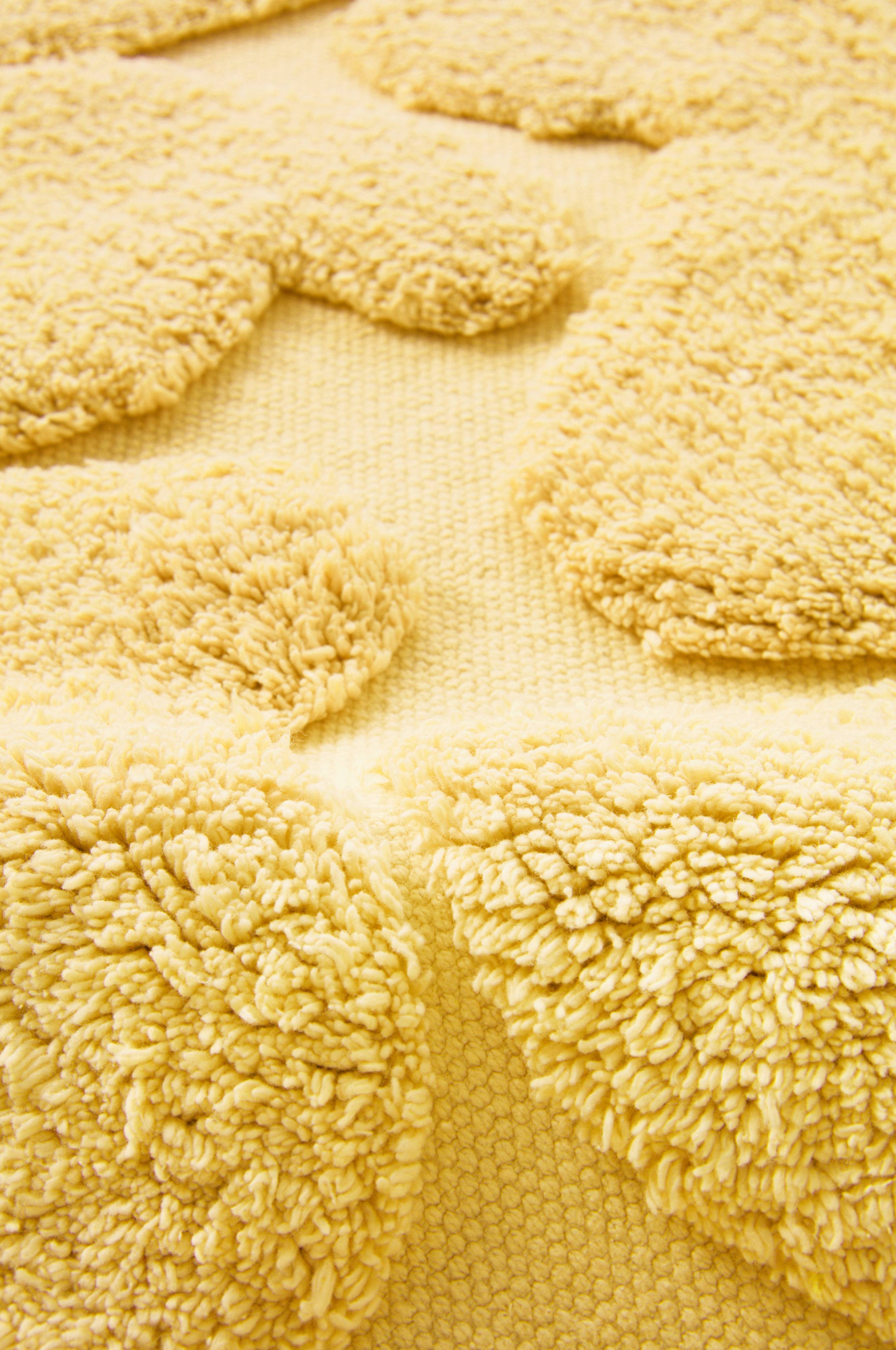Vevd teppe av bomull med tuftede partier som skaper et herlig mønster i luggen. Mønsteret som er ton-i-ton minner om våre store vakre kattedyr. Teppet har fine, knyttede frynser langs kortsidene. Frynselengde 8 cm. Lugghøyde 1 cm. Tykkelse 1,1 cm. 1770 g/m².
