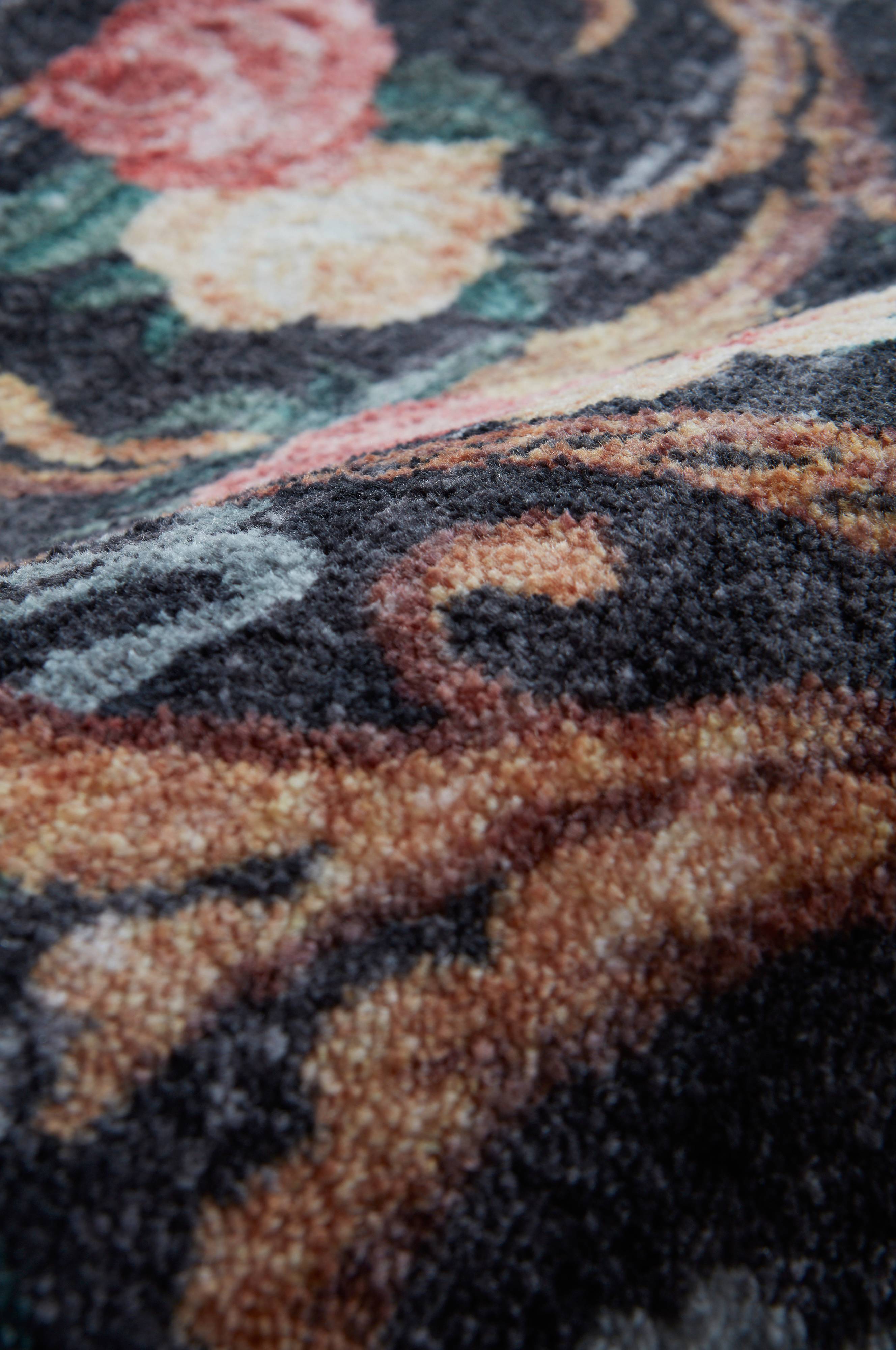 Mykt luggteppe med tett, kort lugg av gjenvunnet polyamid. Teppet er digitaltrykt med et fargerikt, klassisk blomstermønster på svart bunn, og vintagefølelsen er åpenbar. Teppet har vakker glans, og det digitale trykket gir et mykt og mer distinkt trykk med klar fargegjengivelse. Lugghøyde 0,9-1 cm. Tykkelse 1,1-1,2 cm. 2400-2600 g/m².
