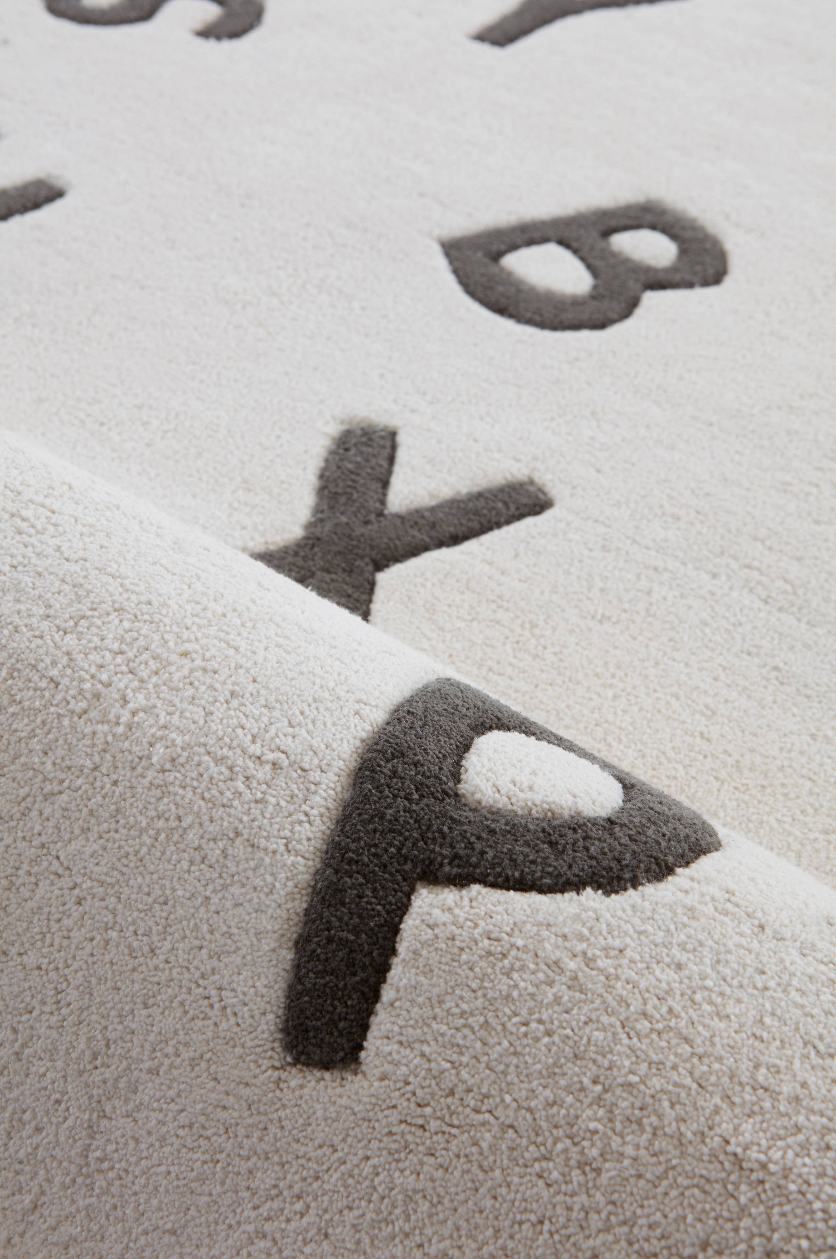 Håndtuftet teppe av økologisk bomull med tett lugg. Teppet har spesiell form og er mykt og deilig å sitte og leke på. Bokstavene kan inspirere til læring. Lugghøyde 1-1,2 cm. Tykkelse 1,4-1,5 cm. 3200-3400 g/m².