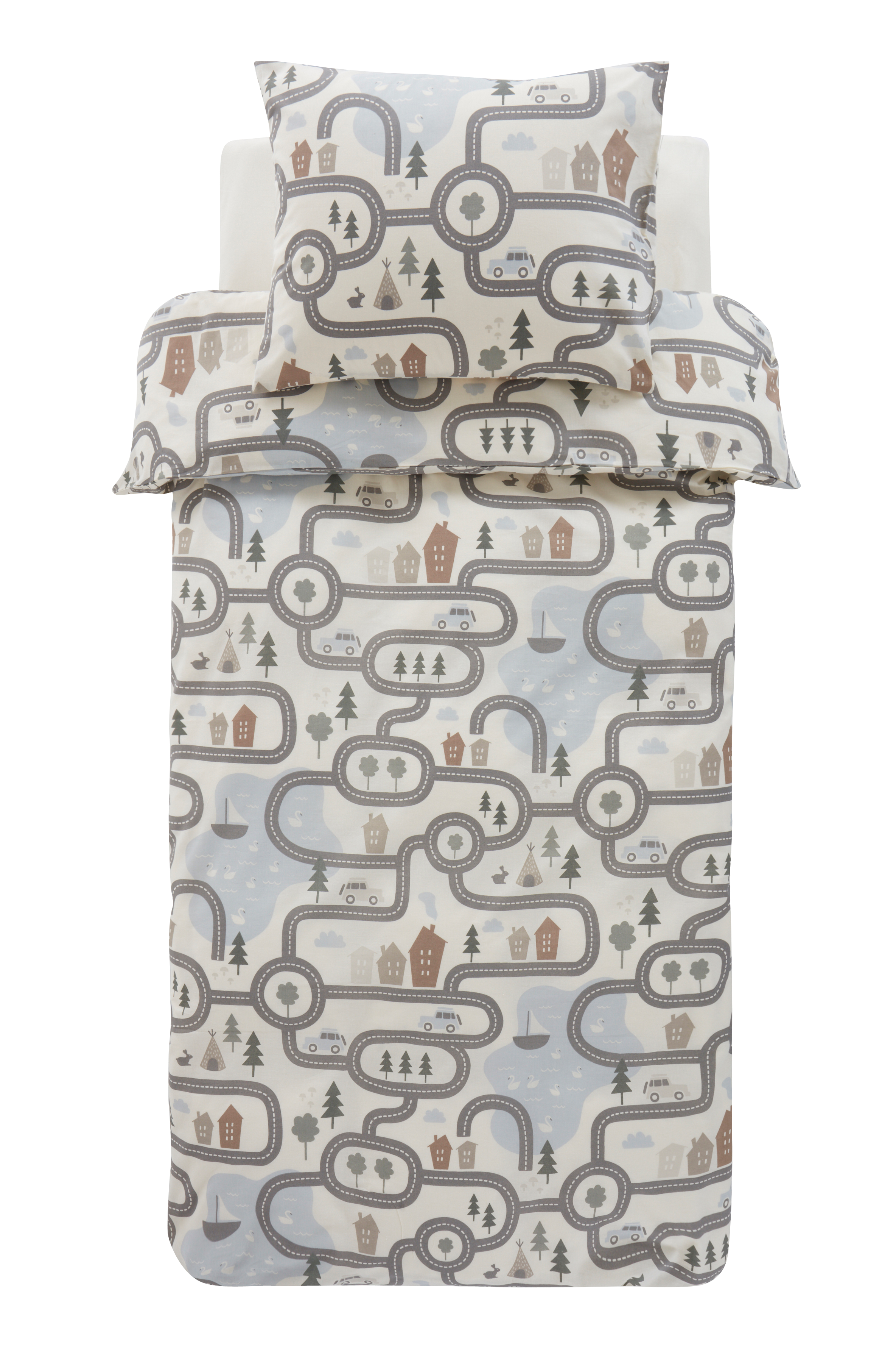 Sett med dynetrekk, putevar og dra-på-laken i økologisk bomull. Dynetrekk og putevar har mønstertrykk i milde, harmoniske farger. Motivet er en myldrende by med veier, hus, dyr og natur. Dra-på-lakenet er ensfarget i en matchende kremhvit farge. Strikk i hjørnene gjør at dra-på-lakenet sitter godt på madrassen. Det er deilig å sove i økologisk bomull - svalt og mykt mot huden. Trådtetthet på 144 tc. (Trådtettheten forteller om antallet tråder, thread counts, pr. kvadrattomme i et stoff. Jo høyere trådtetthet, desto høyere kvalitet.)