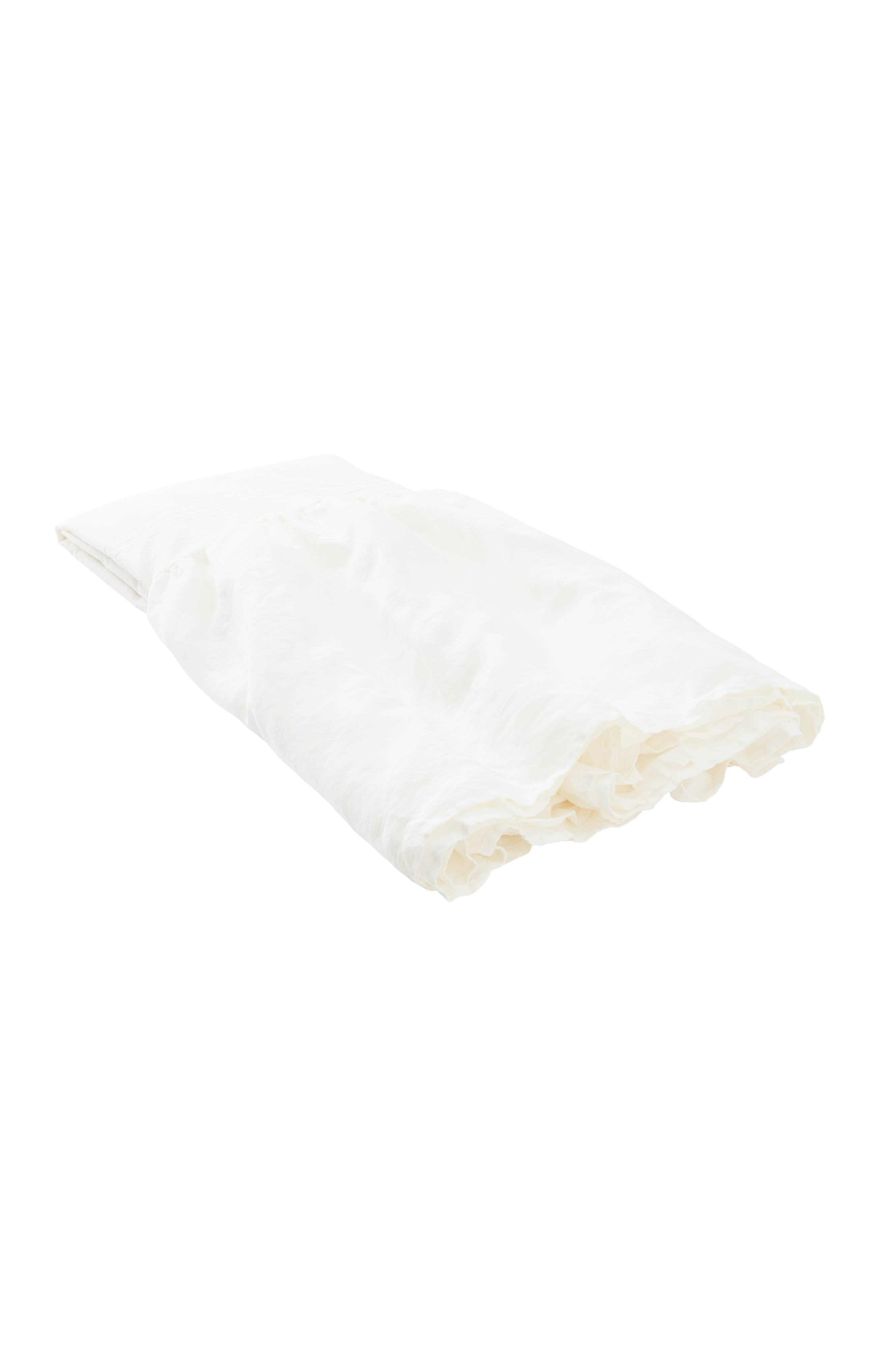 Ensfarget sengekappe med skjørt av plaggvasket lin og flate (overside) av bomull. Det er lett å elske lin, dets egenskaper, følelse og struktur.