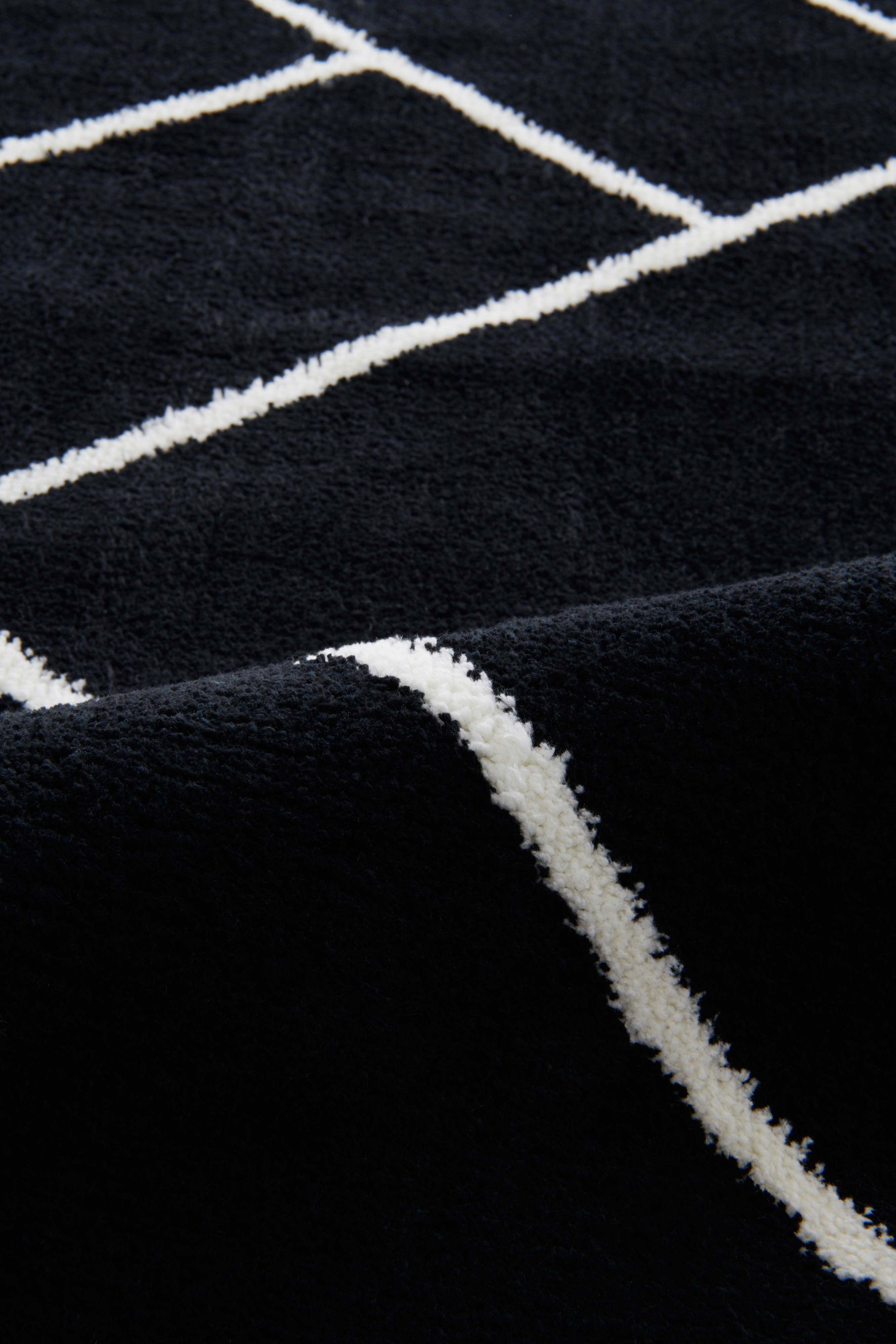 Ensfarget, glattvevd luggteppe av polyester med grafisk mønster. Den tette luggen er myk, gir rommet varme og demper lyd. Lugghøyde 10 mm, 1400 g/m².