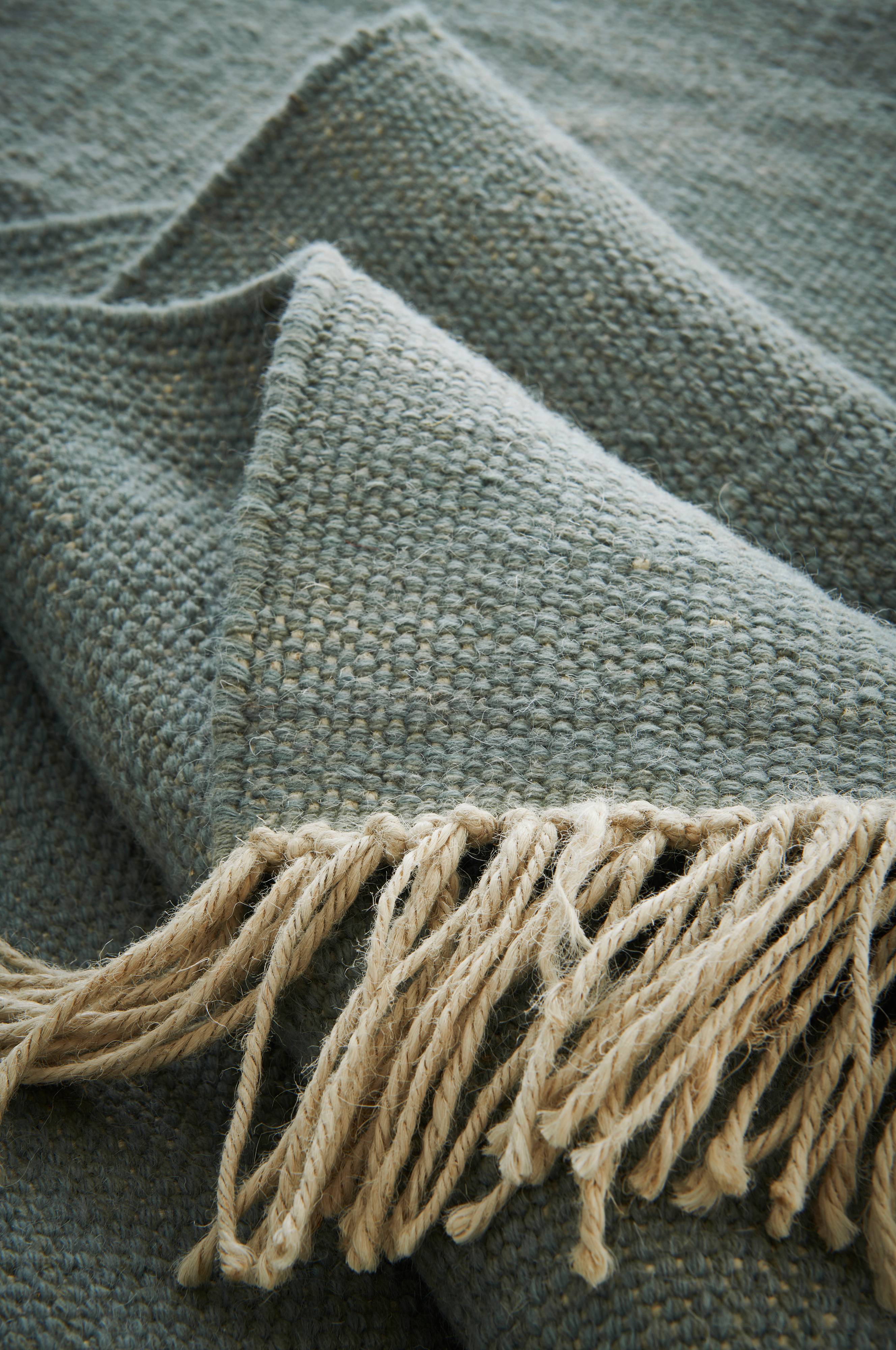 Håndvevd teppe av ull og bomull med varp av jute. Den fine kvaliteten gjør at teppet gir et naturlig inntrykk. Frynser 10 cm, 1400 g/m².
