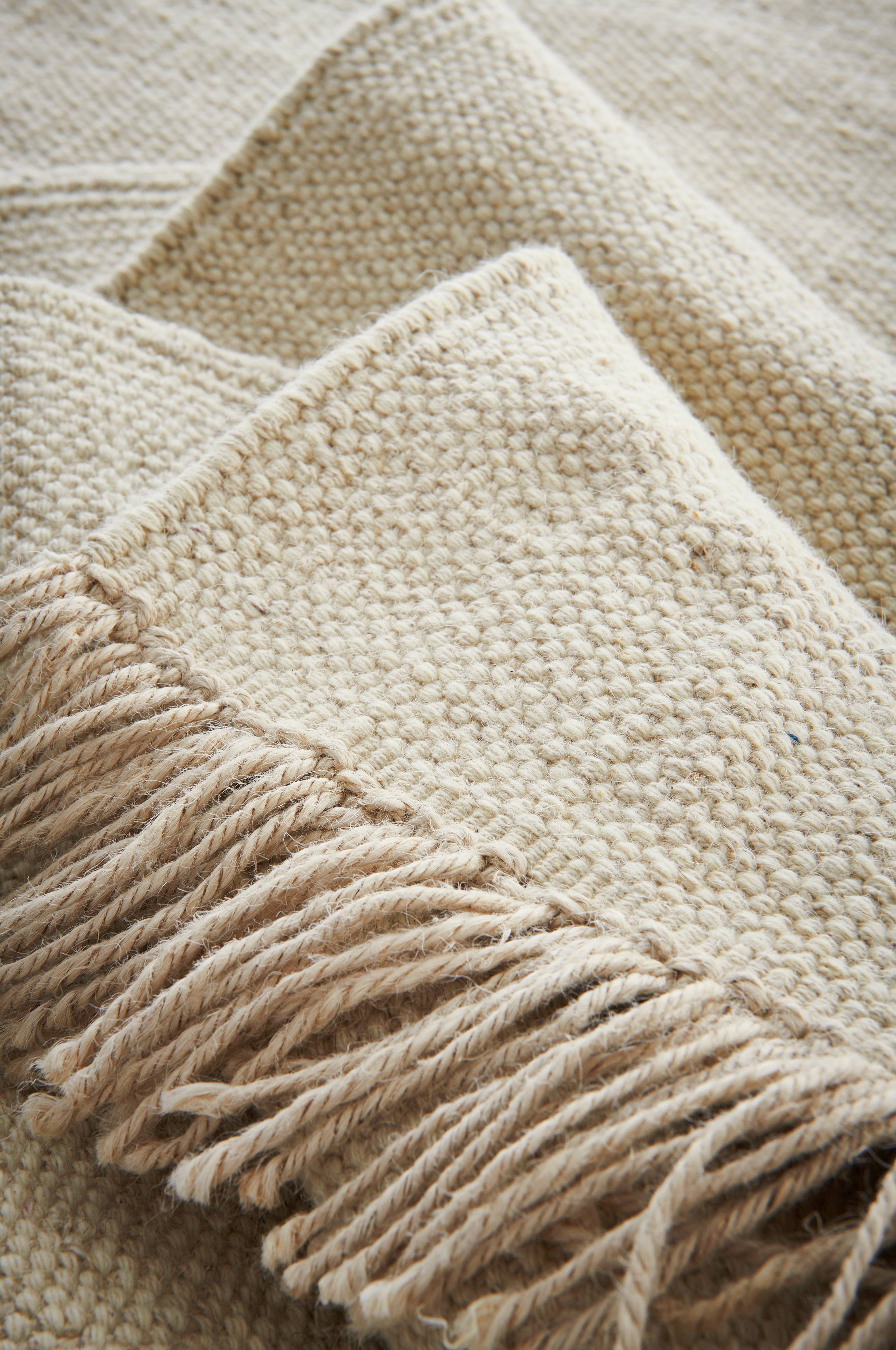 Håndvevd teppe av ull og bomull med varp av jute. Den fine kvaliteten gjør at teppet gir et naturlig inntrykk. Frynser 10 cm, 1400 g/m².