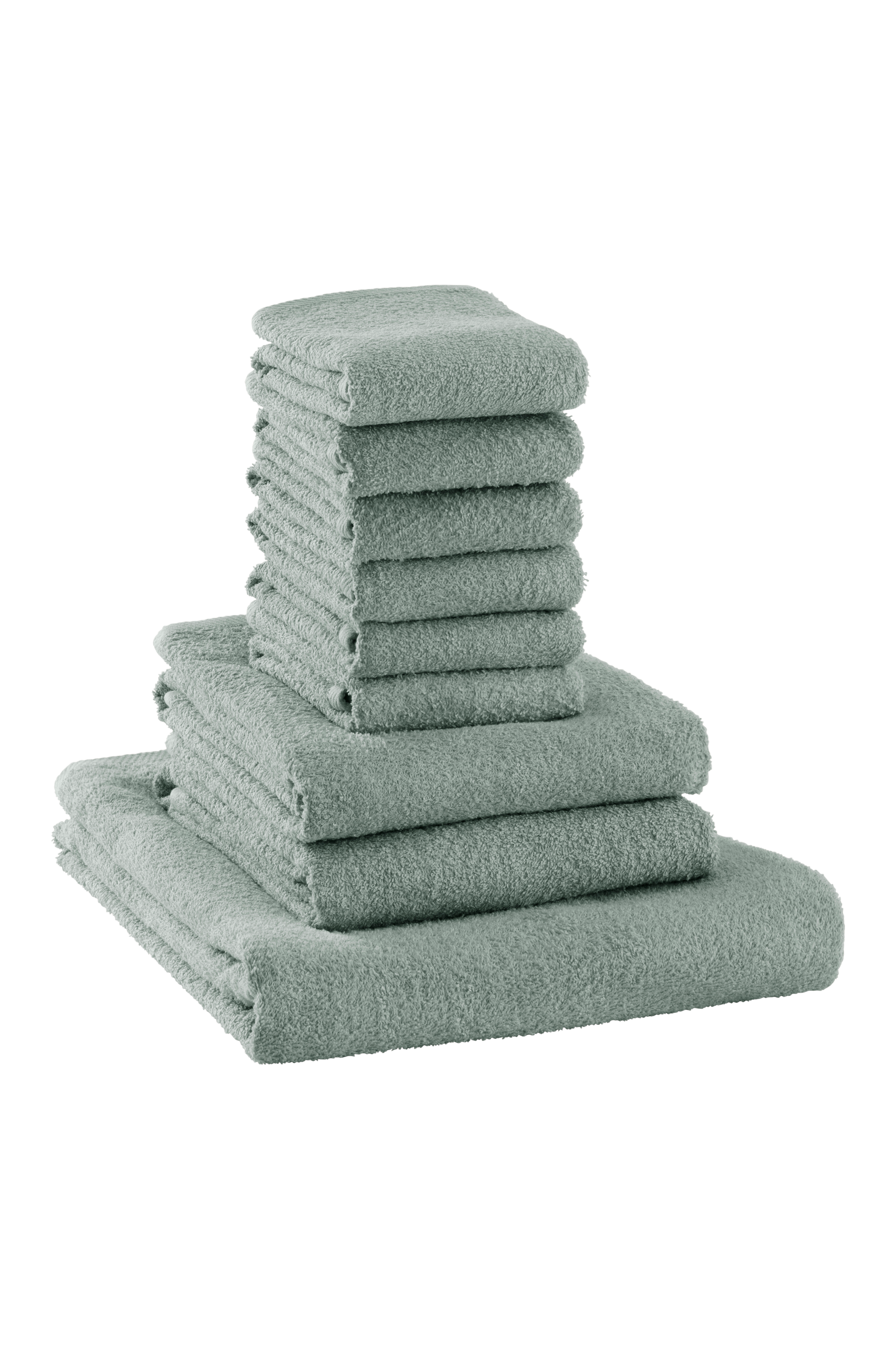 9-pk frottésett i myk, ensfarget bomullsfrotté som er hurtigtørkende og har en gramvekt på 360 g/m². Badet blir enhetlig og fint matchet med all frotté i samme farge. Frottésettet inneholder seks håndklær, to badehåndklær og et badelaken.