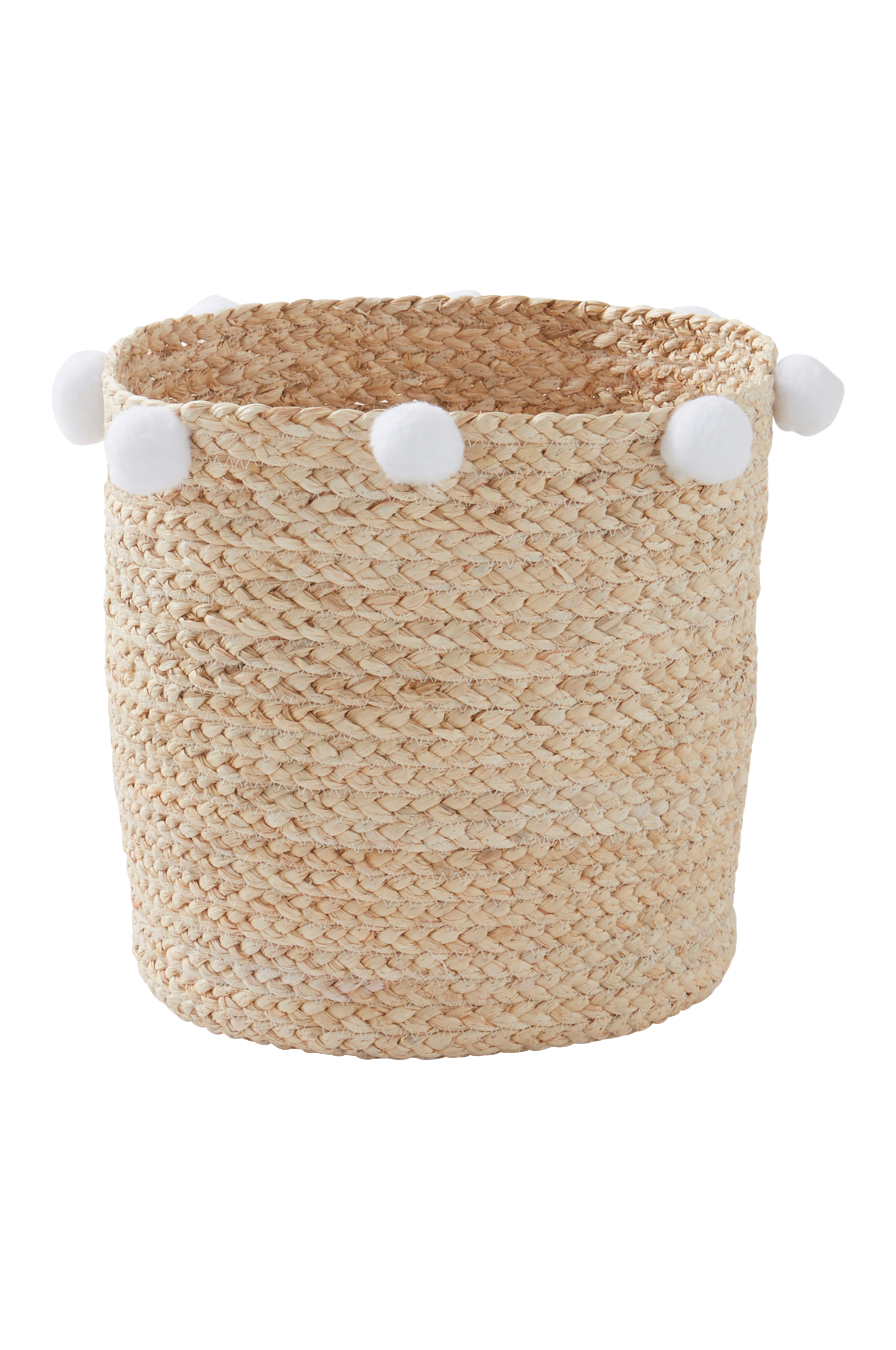 Oppbevaringskurv i flettet tau som er produsert av skallet rundt maiskolben. Det blir et slitesterkt tau å flette med. Kurven er dekorert med baller øverst rundt kanten. Det naturlige materiale gjør hver kurv unik.