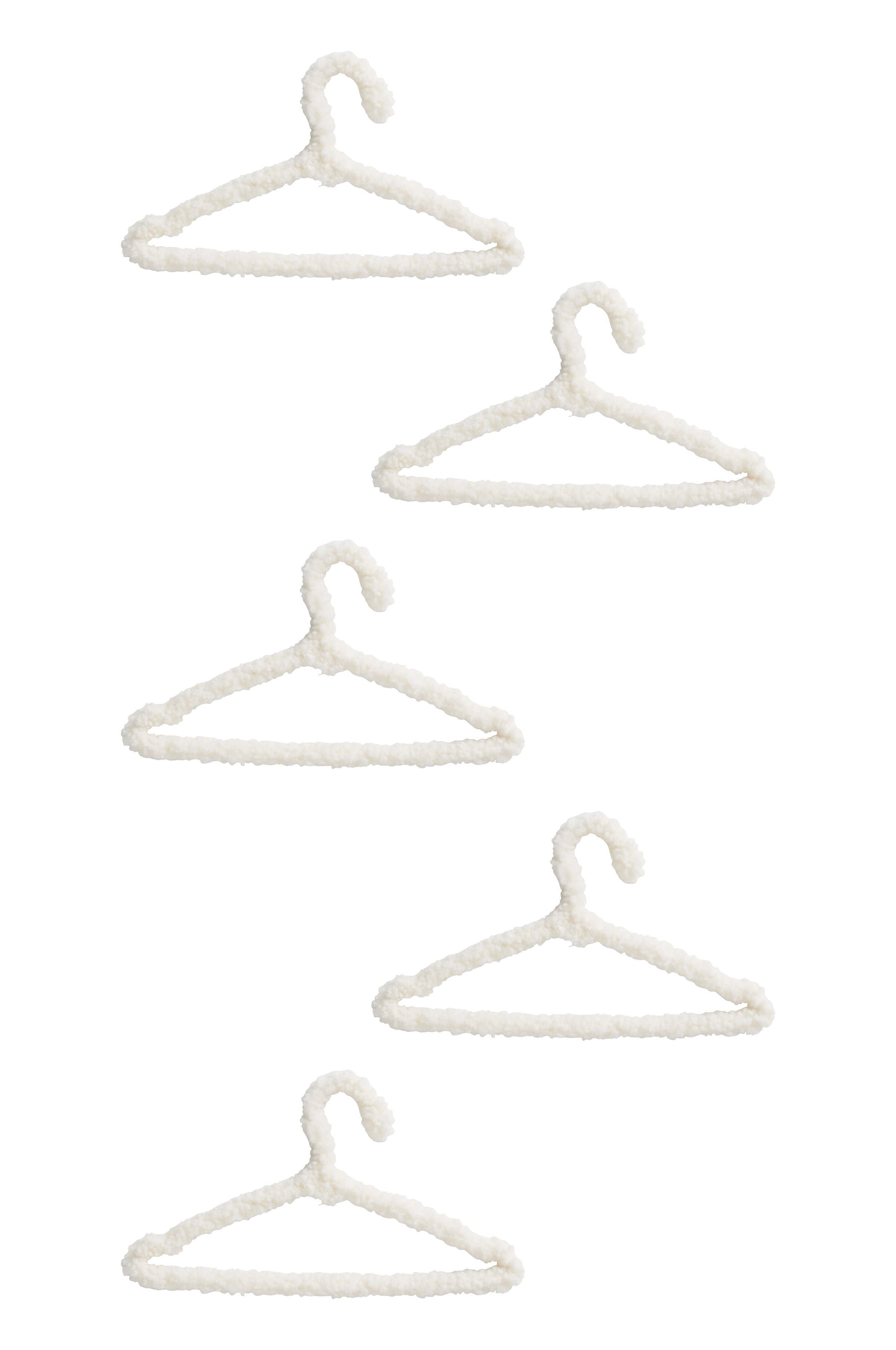 5-pk kleshengere av rustfritt stål kledd med mykt og herlig teddystoff av polyester. Kleshengerne er fine å henge på en hattehylle i gangen eller et klesstativ på soverommet.