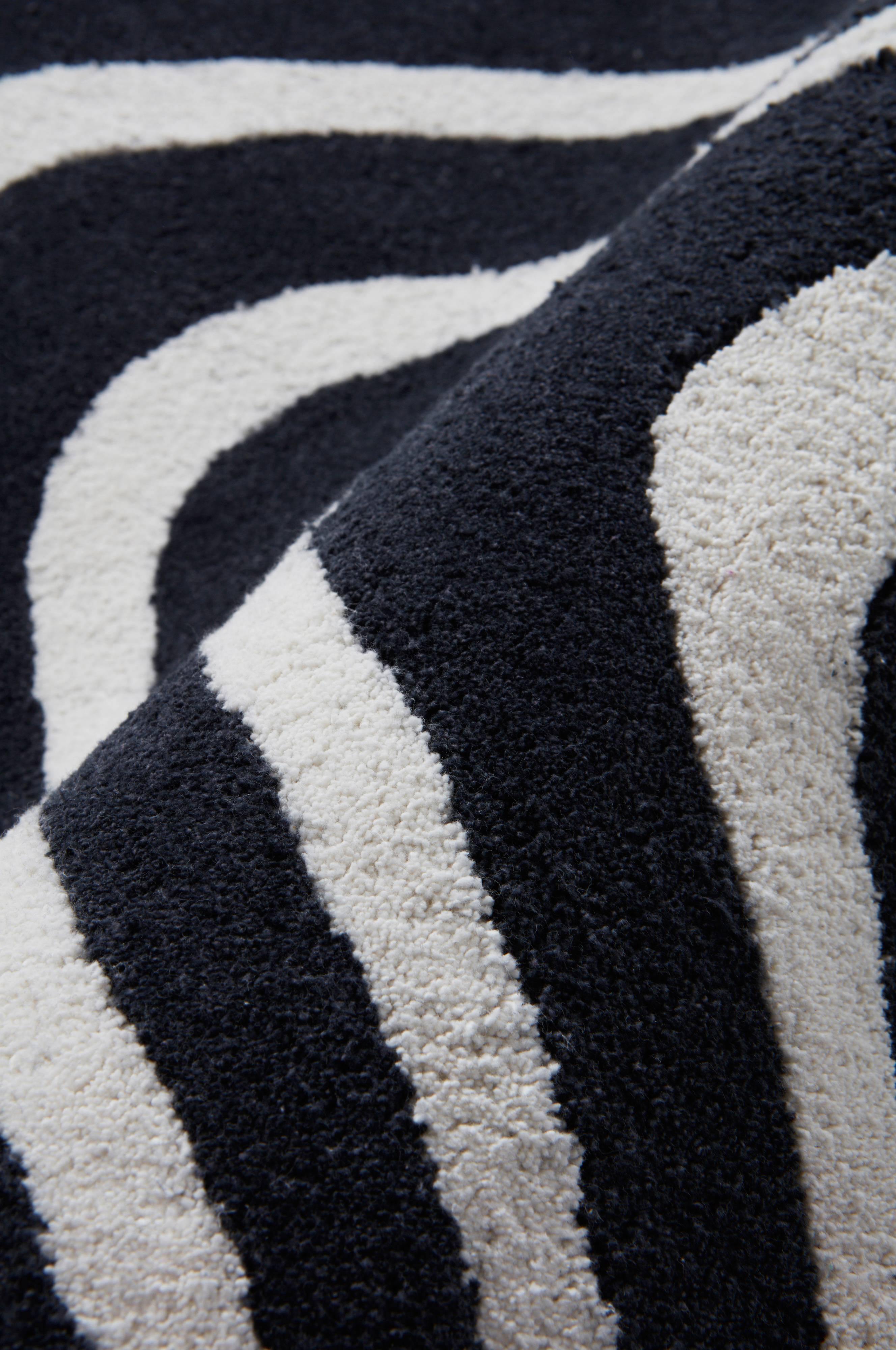 Håndtuftet teppe av økologisk bomull. Det herlige teppet har myk lugg med garnfarget sebramønster, og formen er herlig uregelmessig. Det fine håndverket gjør hvert teppe unikt. Lugghøyde 0,8-1 cm. Tykkelse 1,6-2 cm. 3000-3200 g/m².