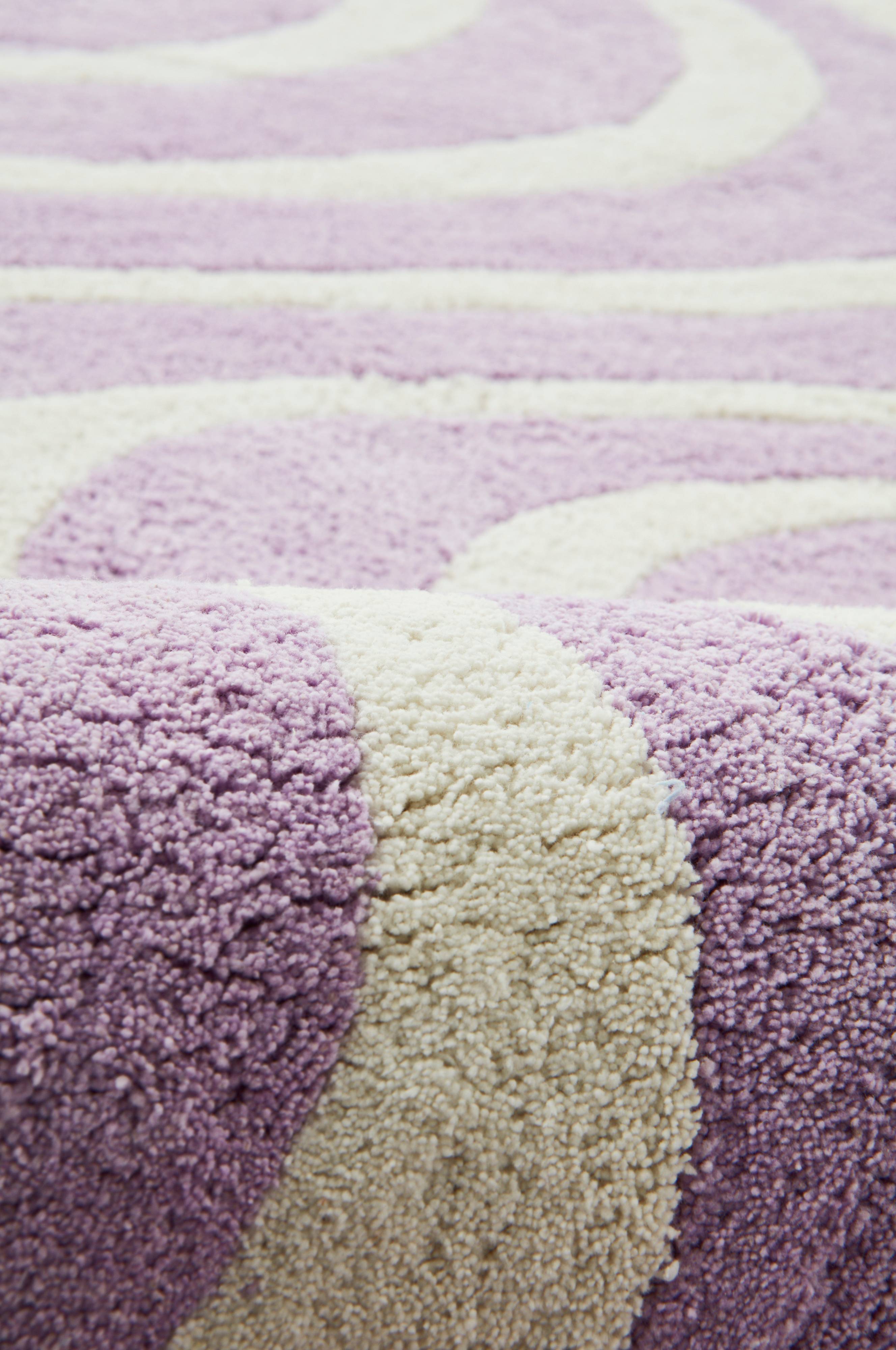 Håndtuftet teppe av økologisk bomull. Det herlige teppet har myk lugg med garnfarget sebramønster, og formen er herlig uregelmessig. Det fine håndverket gjør hvert teppe unikt. Lugghøyde 0,8-1 cm. Tykkelse 1,6-2 cm. 3000-3200 g/m².