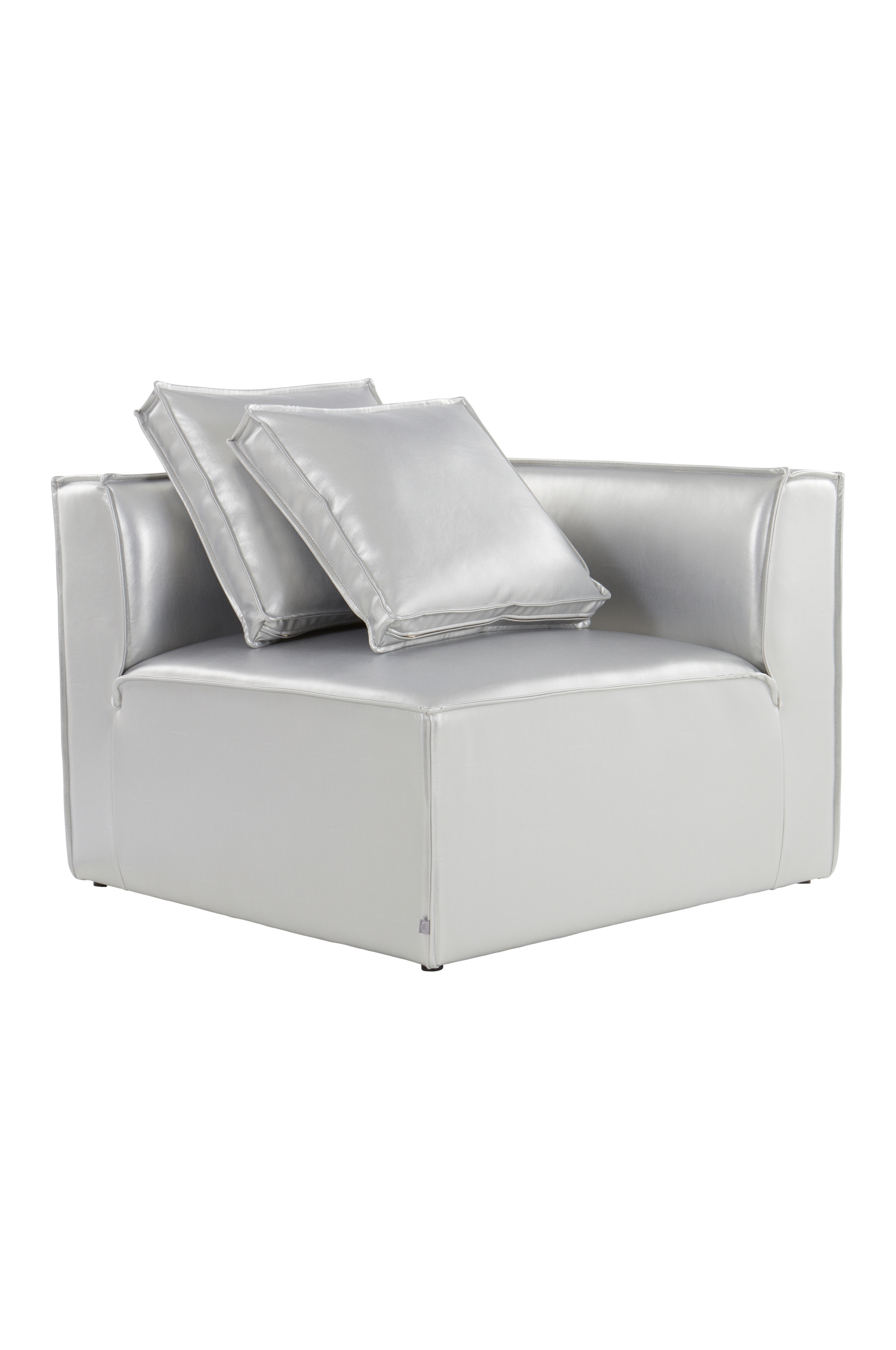 Denne modulen passer som lenestol eller som del av et større møbel som du kombinerer selv. Trekket er av slitesterk polyuretan med lekker sølvfarge. Stoffet har Martindale på 40 000. Leveres med to fine puter i samme stoff som modulen.