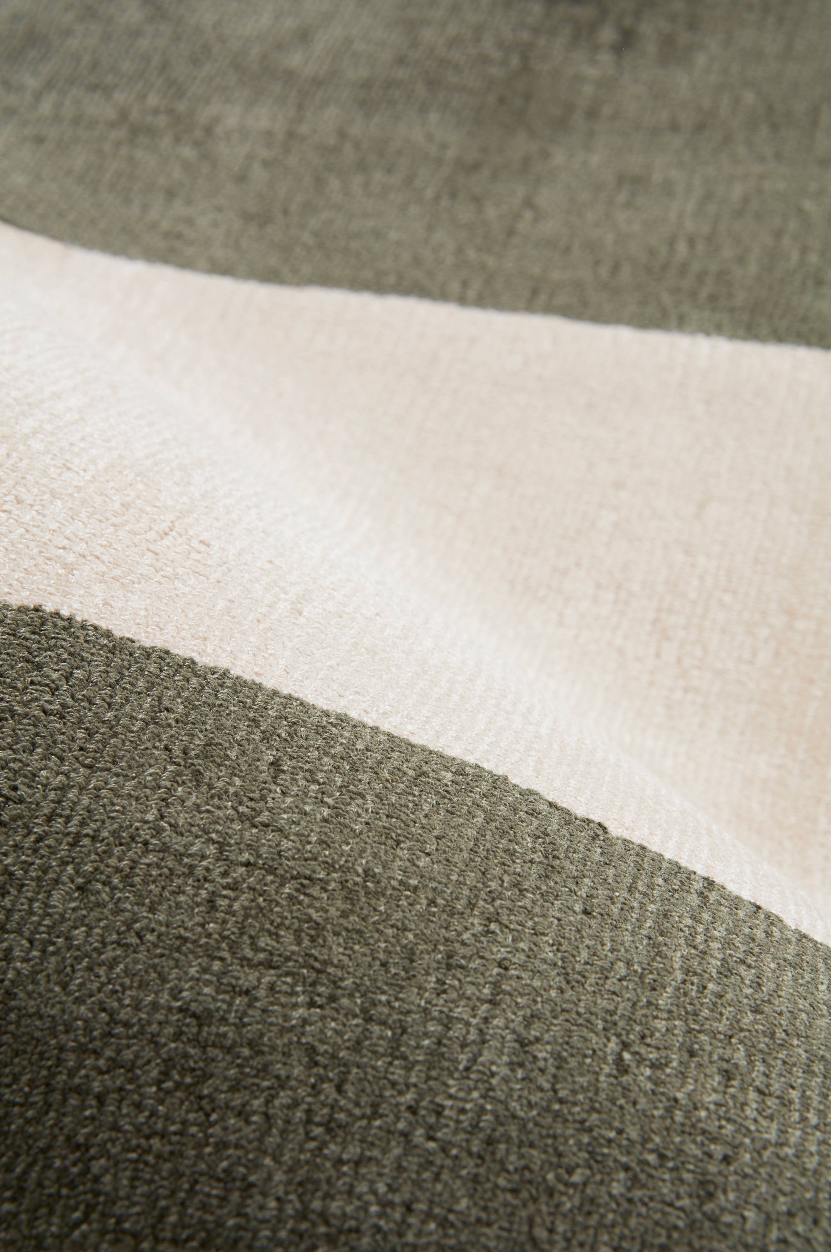 BANDA er et håndvevd viskoseteppe med effektfulle blokkstriper. Det er herlig mykt og glansfullt. Det fine håndverket gjør hvert teppe unikt. Lugghøyde 0,5-0,6 cm. Tykkelse 1-1,1 cm. 2000 g/m².