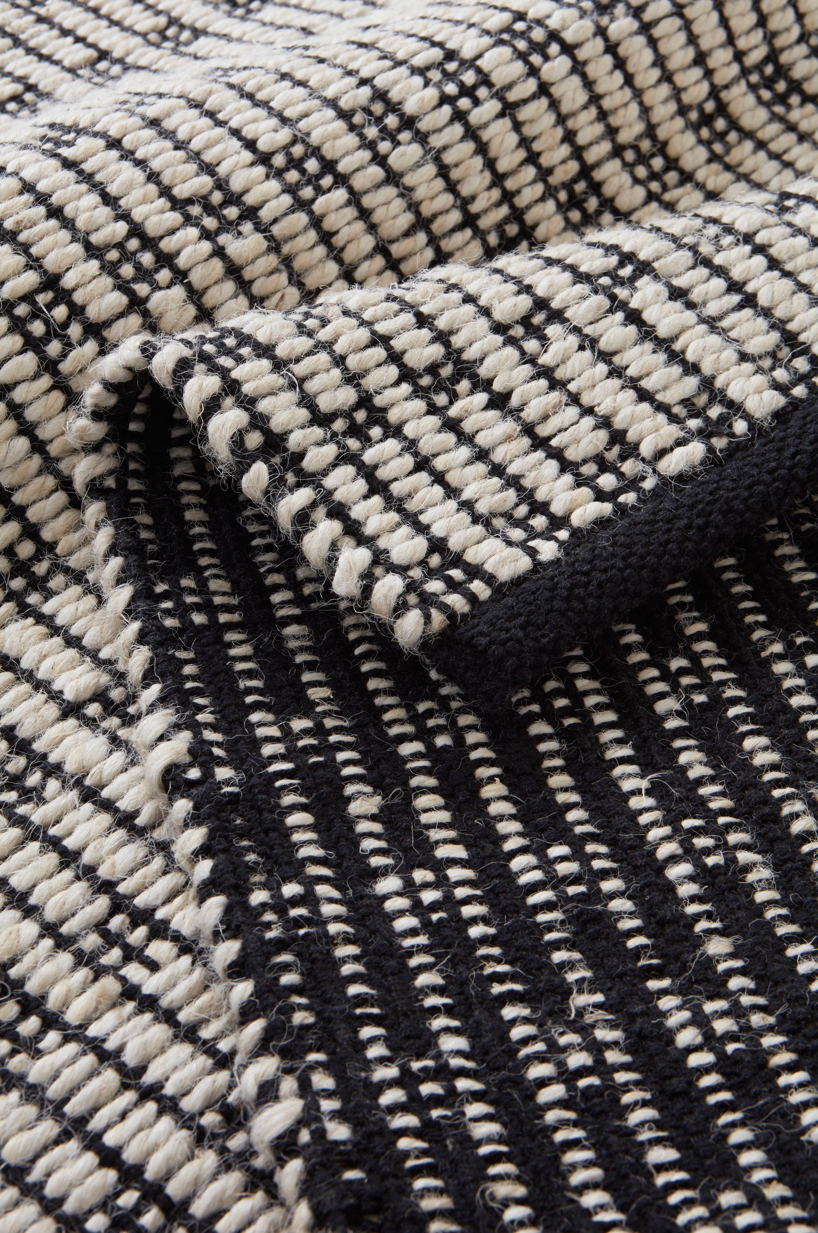 Håndvevd teppe i herlig blanding av jute og bomull. Teppet har et pent vevd mønster i svart og naturhvit med svart, solid kant langs kortsidene. Jute er et rustikt naturmateriale. Et håndlaget teppe er et fint håndverk, og hvert teppe er unikt. Tykkelse 0,5 cm. 1900 g/m².