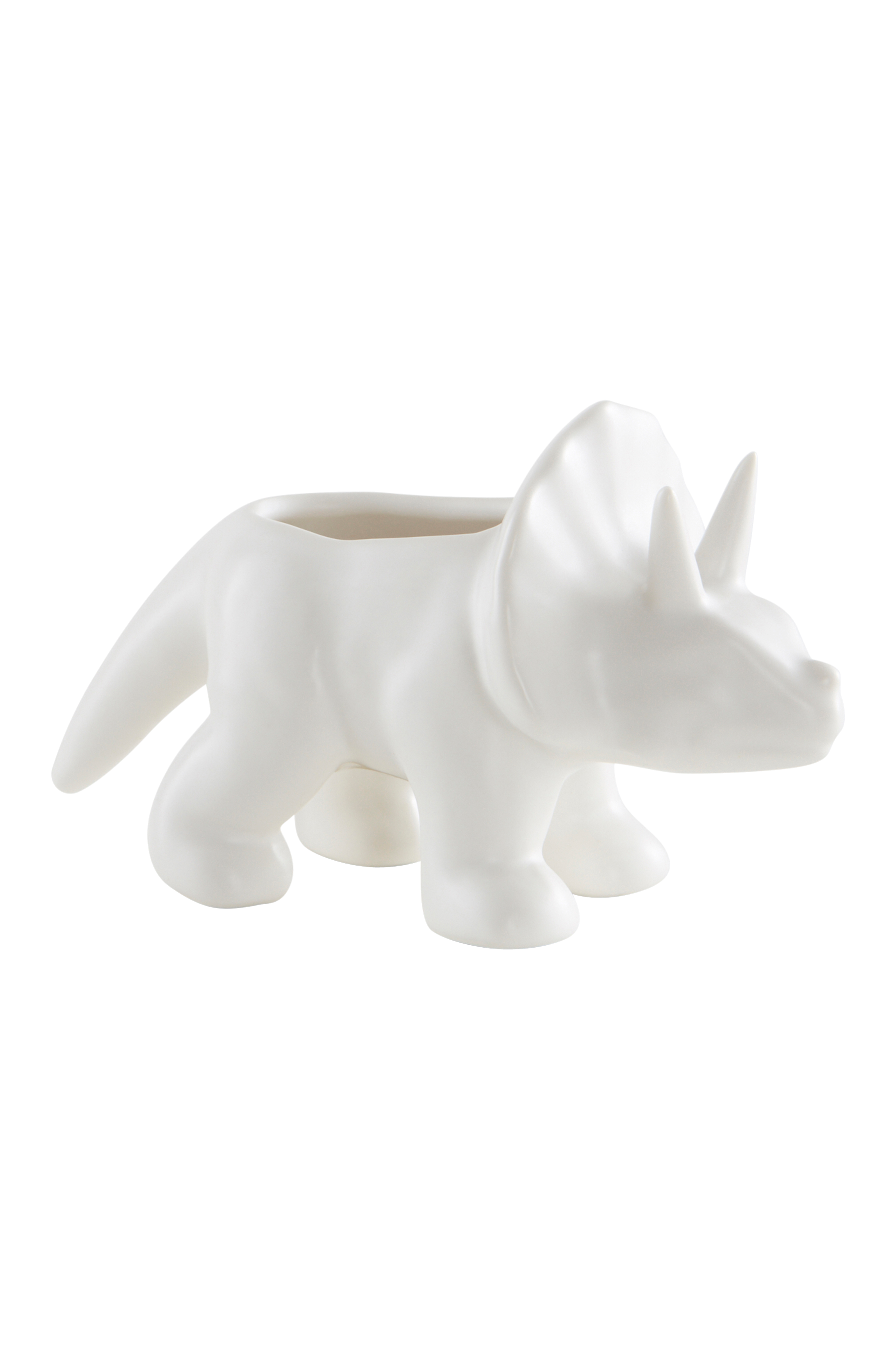 Krukke av keramikk. Krukken har form som en dinosaurus, søt og liten, passer perfekt i barnerommet. Ut- og innsiden er glasert i samme farge. Husk at keramikk kan slippe gjennom fukt.