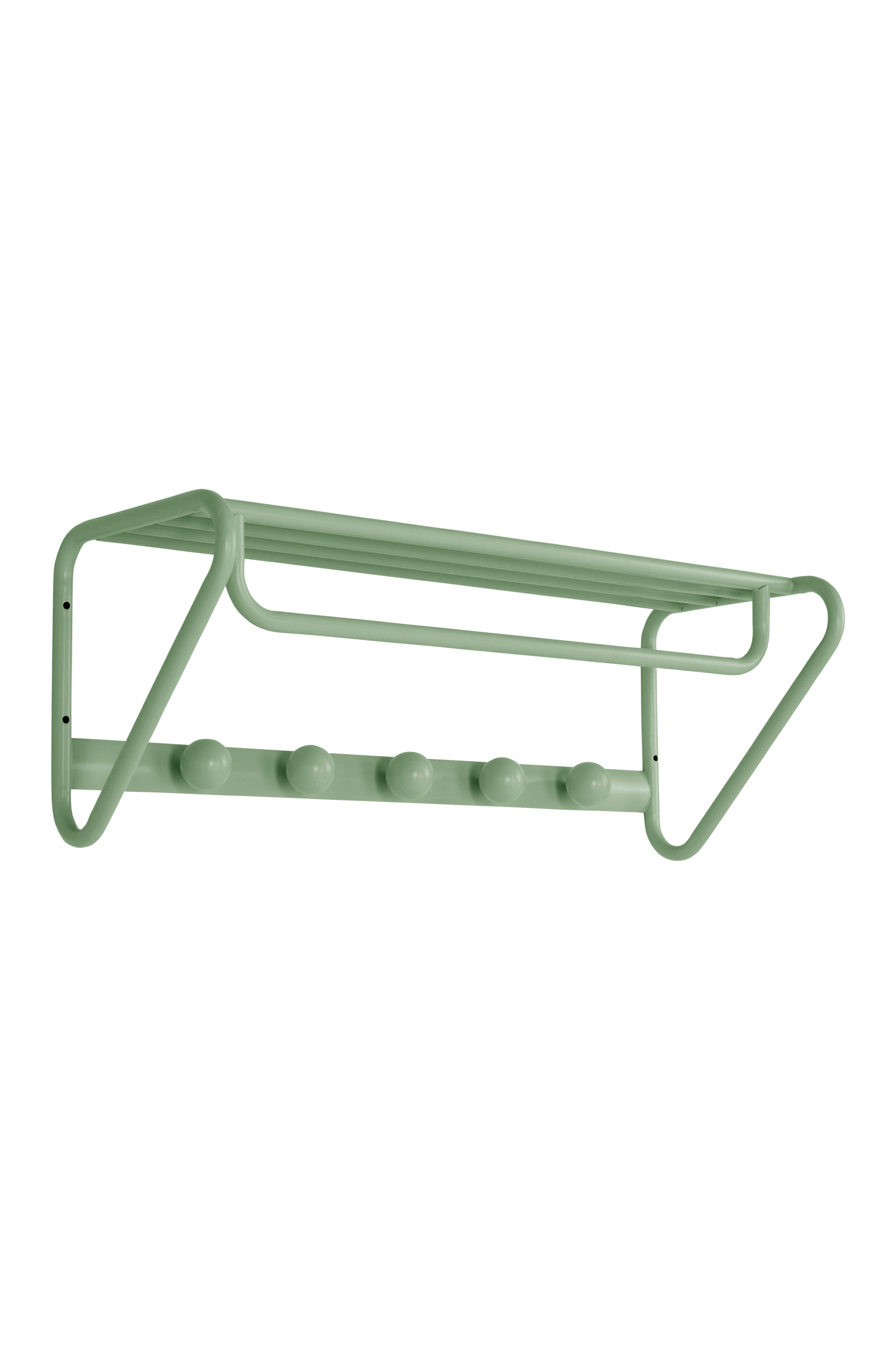Hattehylle av stål i leken design med fem runde knagger, stang til kleshengere og en hylle øverst. Hattehyllen er pulverlakkert. Skrues fast i veggen. Skruer medfølger ikke.