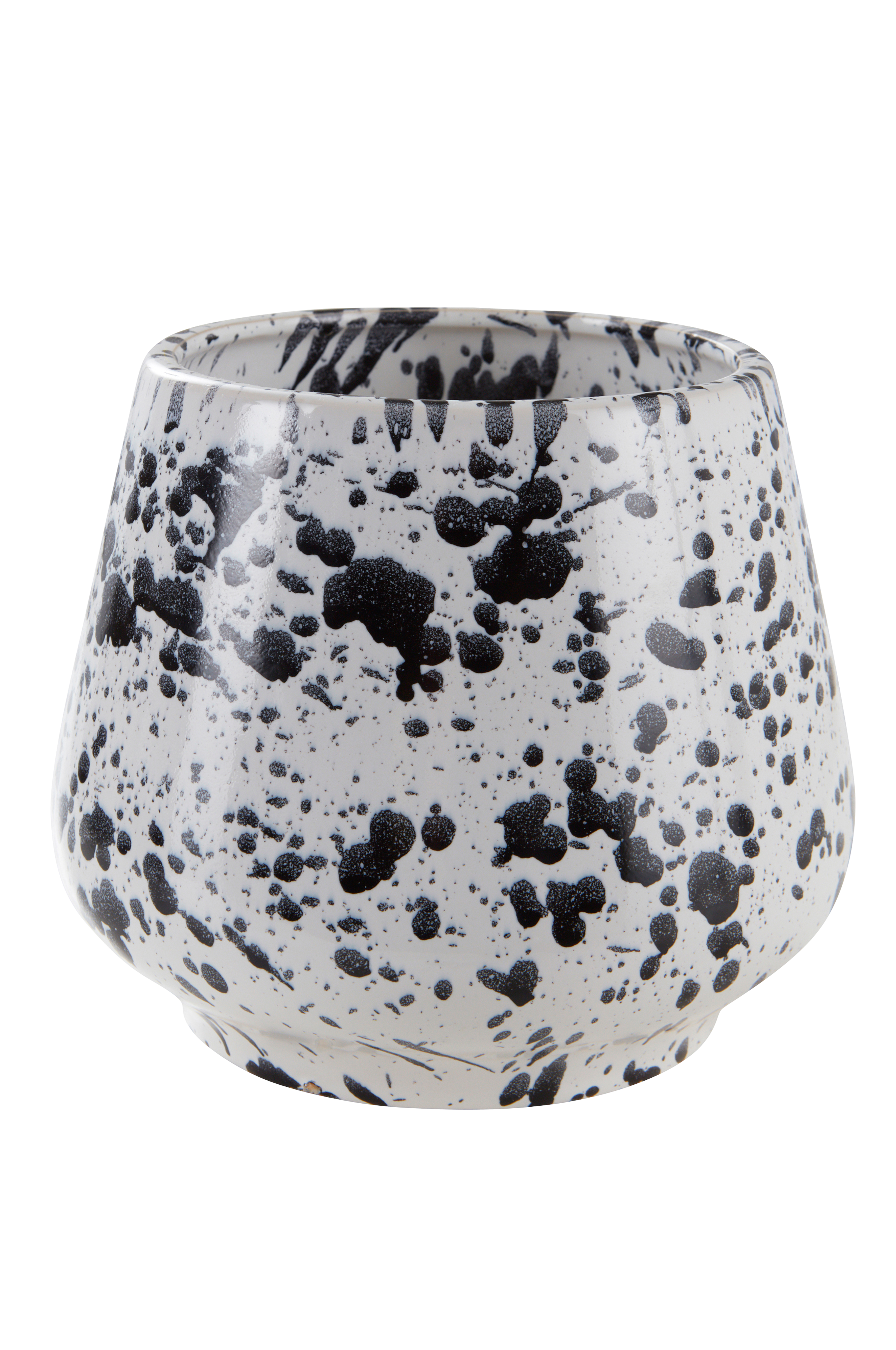 Håndlaget potte av keramikk med lekkert flekkmønster som har herlig retrofølelse. Potten har mykt avrundet form, noe avsmalnende oppover, og glasuren har høyblank overflate. Innsiden er også glasert. Det fine håndverket gjør hver potte unik. Husk at keramikk kan slippe gjennom fukt.