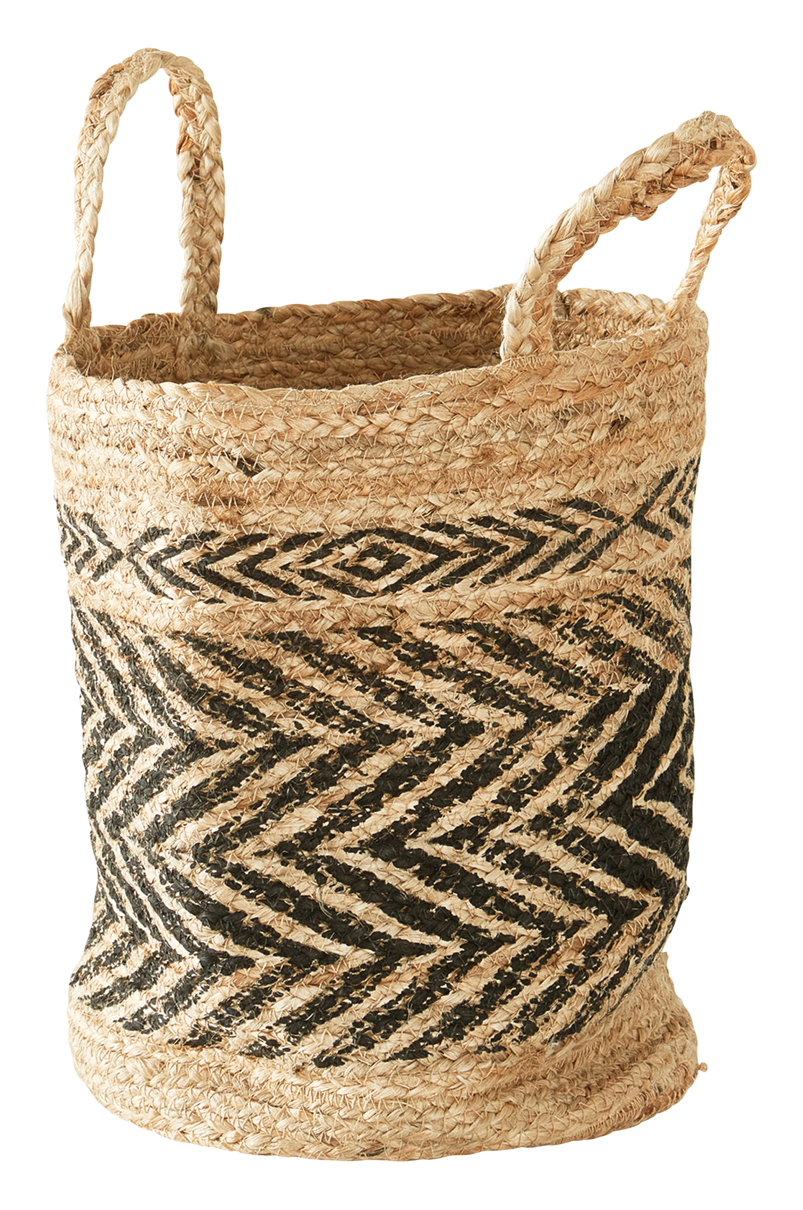 Dekorativ flettet oppbevaringskurv i jute med trykt sikksakk-mønster. Passer også som krukke for en boho-chic innredningsstil.