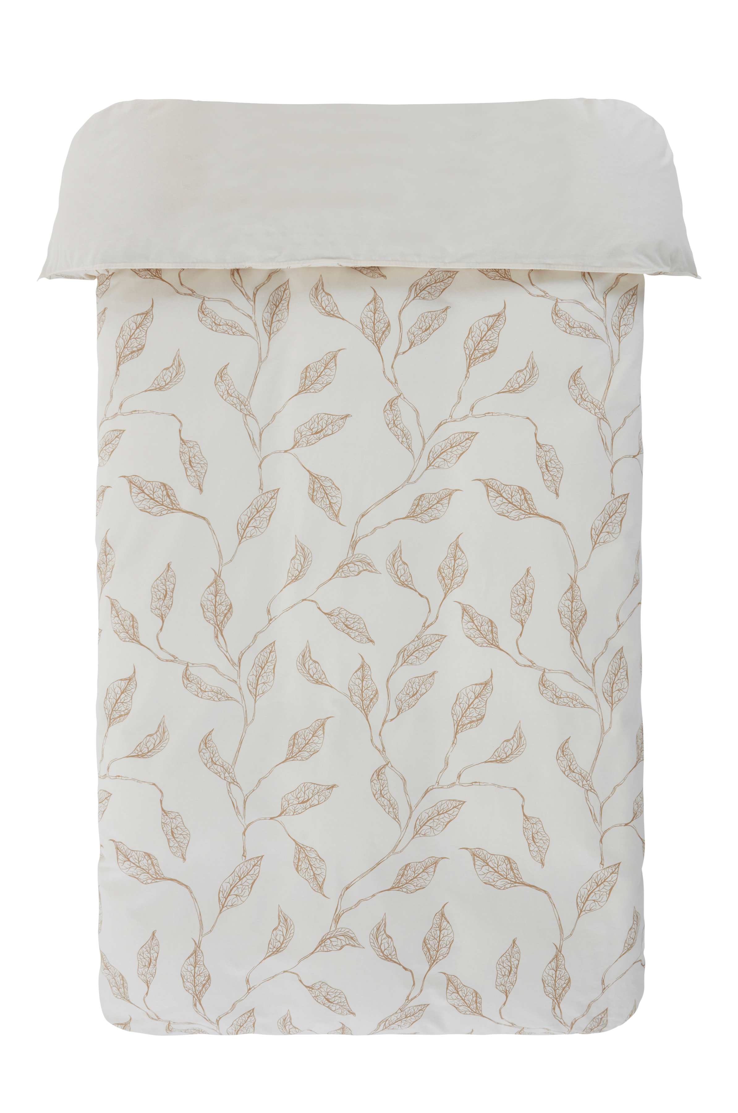 Dynetrekk av myk bomull med trykt bladmønster som er harmonisk i fargeskalaen og passe diskre. 70% av bomullen er gjenvunnet materiale, og stoffet er enzymvasket, noe som gir en myk og behagelig, lett slitt følelse. Bomullsstoff er luftig og deilig, og føles behagelig mot huden. Dobbeltsøm rundt og transparente plastknapper for lukking. Trådtetthet på 120 tc. (Trådtettheten forteller om antallet tråder, thread counts, pr. kvadrattomme i et stoff. Jo høyere trådtetthet, desto høyere kvalitet.)