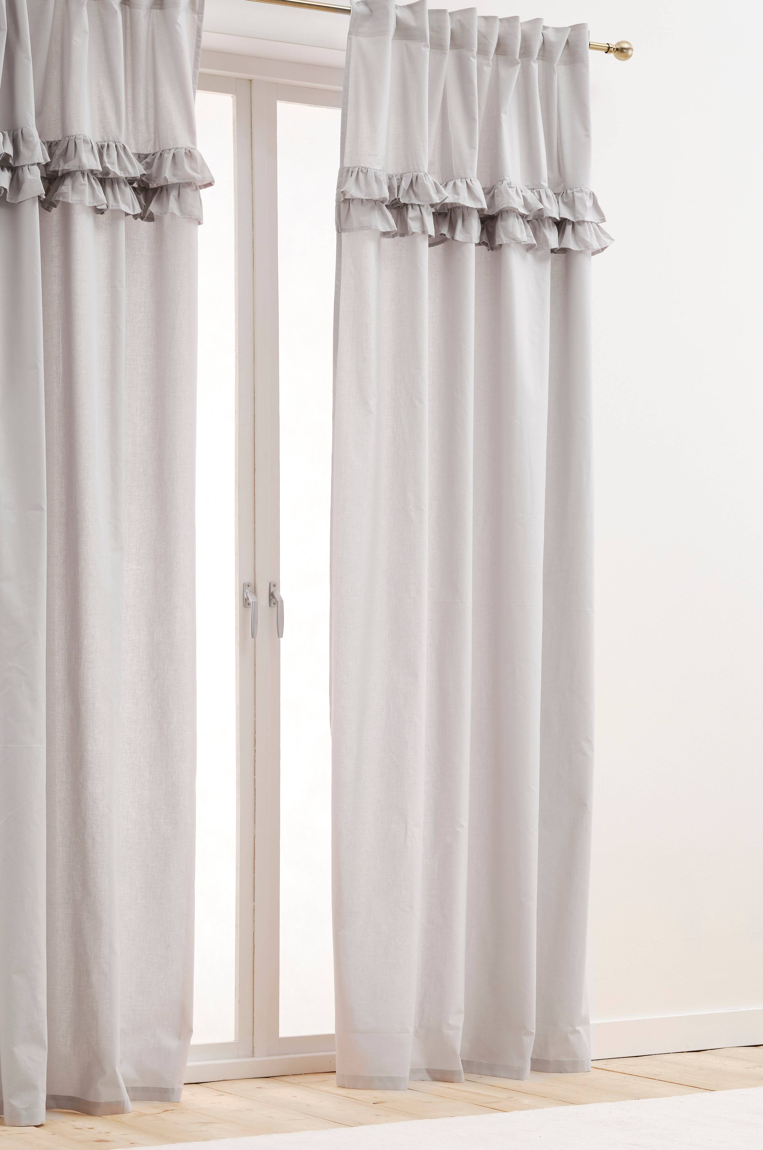 2-pakning med gardinlengder i økologisk bomull. BILLY er en ensfarget gardin med dekorative volangdetaljer og påsydd multifunksjonelt bånd.