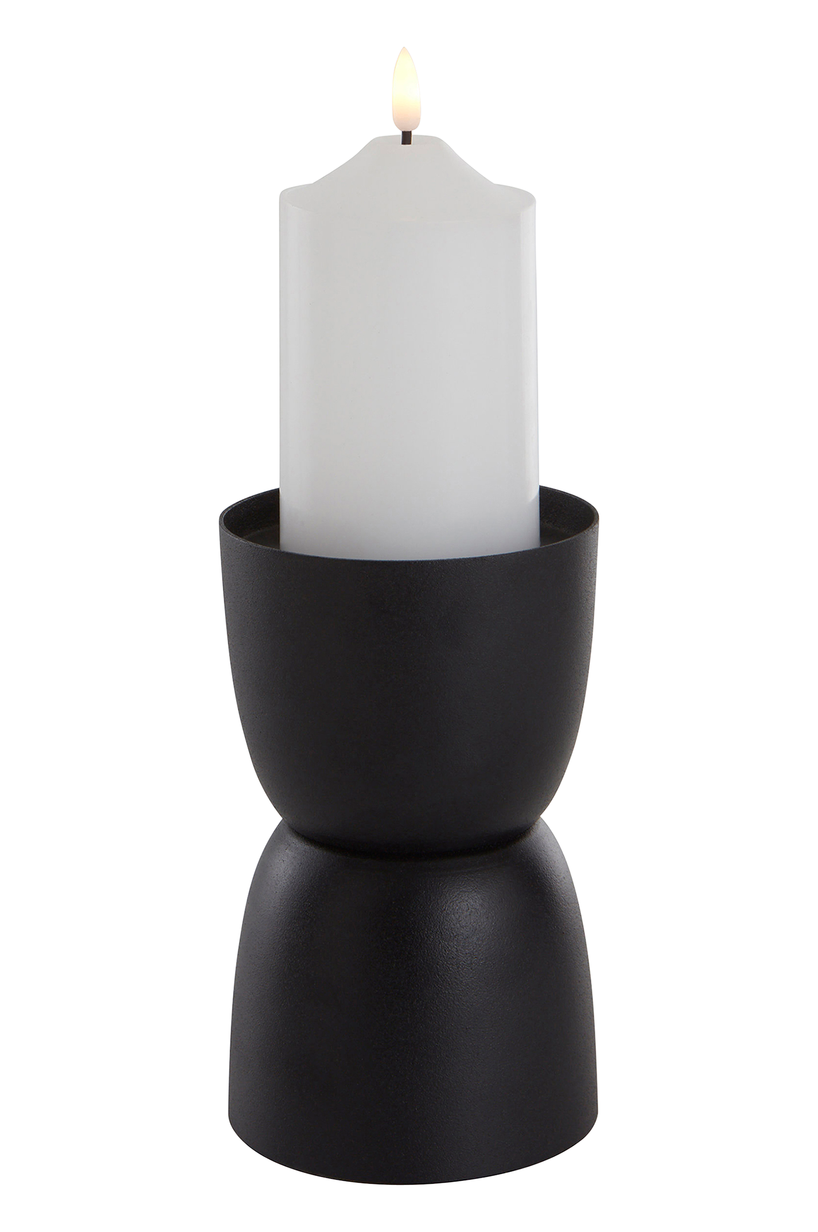 Lysestake av jern med struktur. En stilren lysestake for kubbelys som lyser opp et vakkert dekket bord. Lys medfølger ikke.