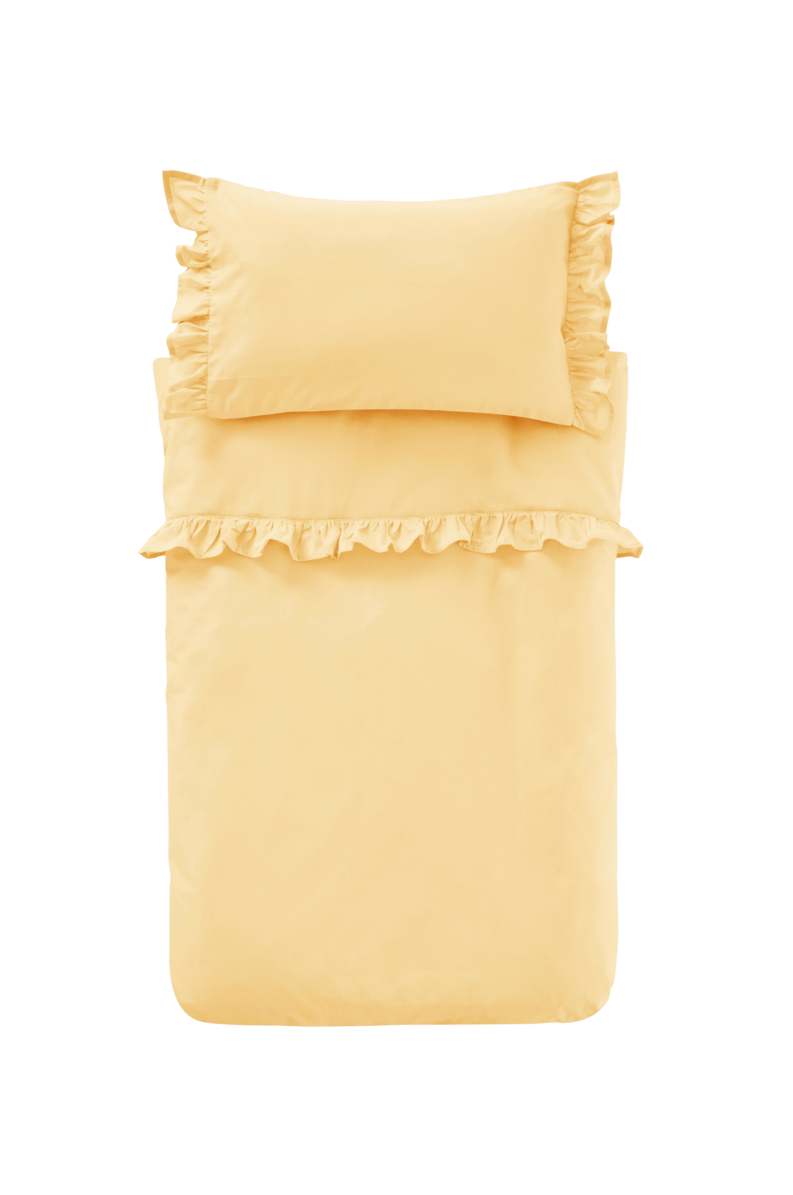 Sengesett i 2 deler av økologisk bomull med dekorativ volangkant. Å re opp med bomull er luftig og mykt mot kroppen. Sengesettet passer til sprinkelseng. Trådtetthet på 144 tc. (Trådtettheten forteller om antallet tråder, thread counts, pr. kvadrattomme i et stoff. Jo høyere trådtetthet, desto høyere kvalitet).