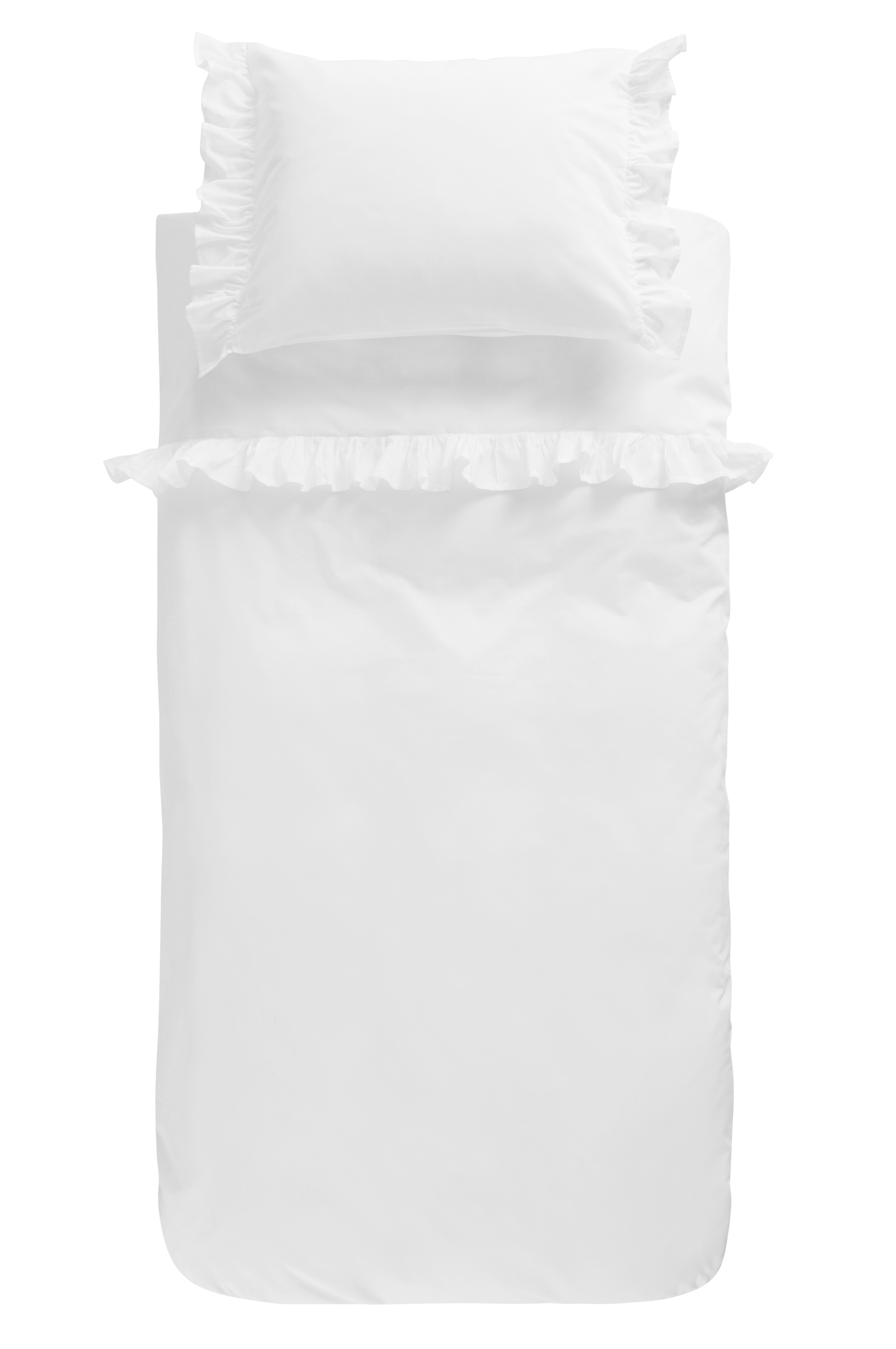 Sengesett i 2 deler av økologisk bomull med dekorativ volangkant. Å re opp med bomull er luftig og mykt mot kroppen. Trådtetthet på 144 tc. (Trådtettheten forteller om antallet tråder, thread counts, pr. kvadrattomme i et stoff. Jo høyere trådtetthet, desto høyere kvalitet).