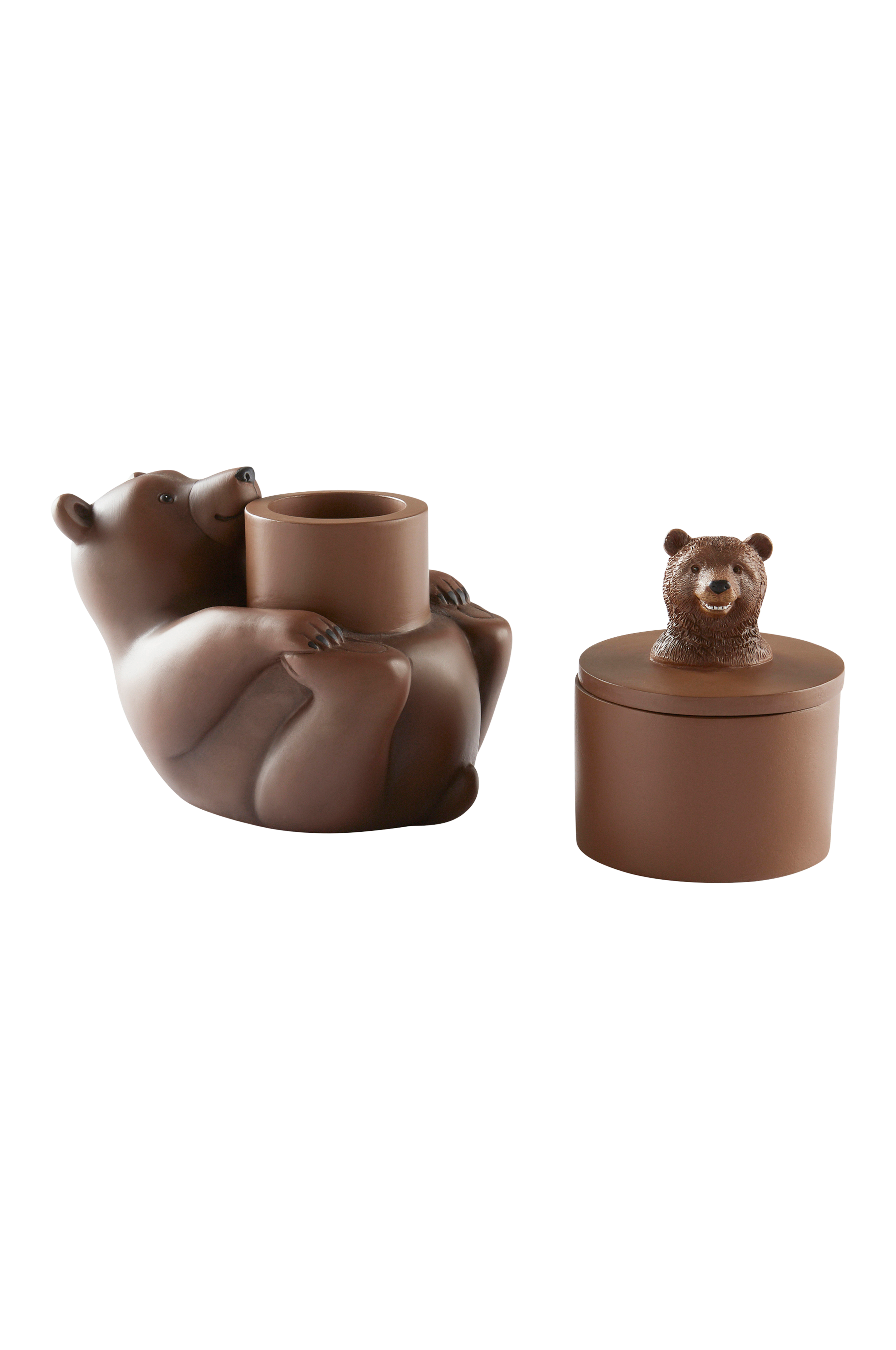 2-pk krukker i polyresin. Den ene lille krukken har lokk med et lite bjørnehode som knott, og den andre har en liggende bjørn som holder krukken på magen. To praktiske små bokser som passer perfekt til at oppbevare penner eller smykker i.