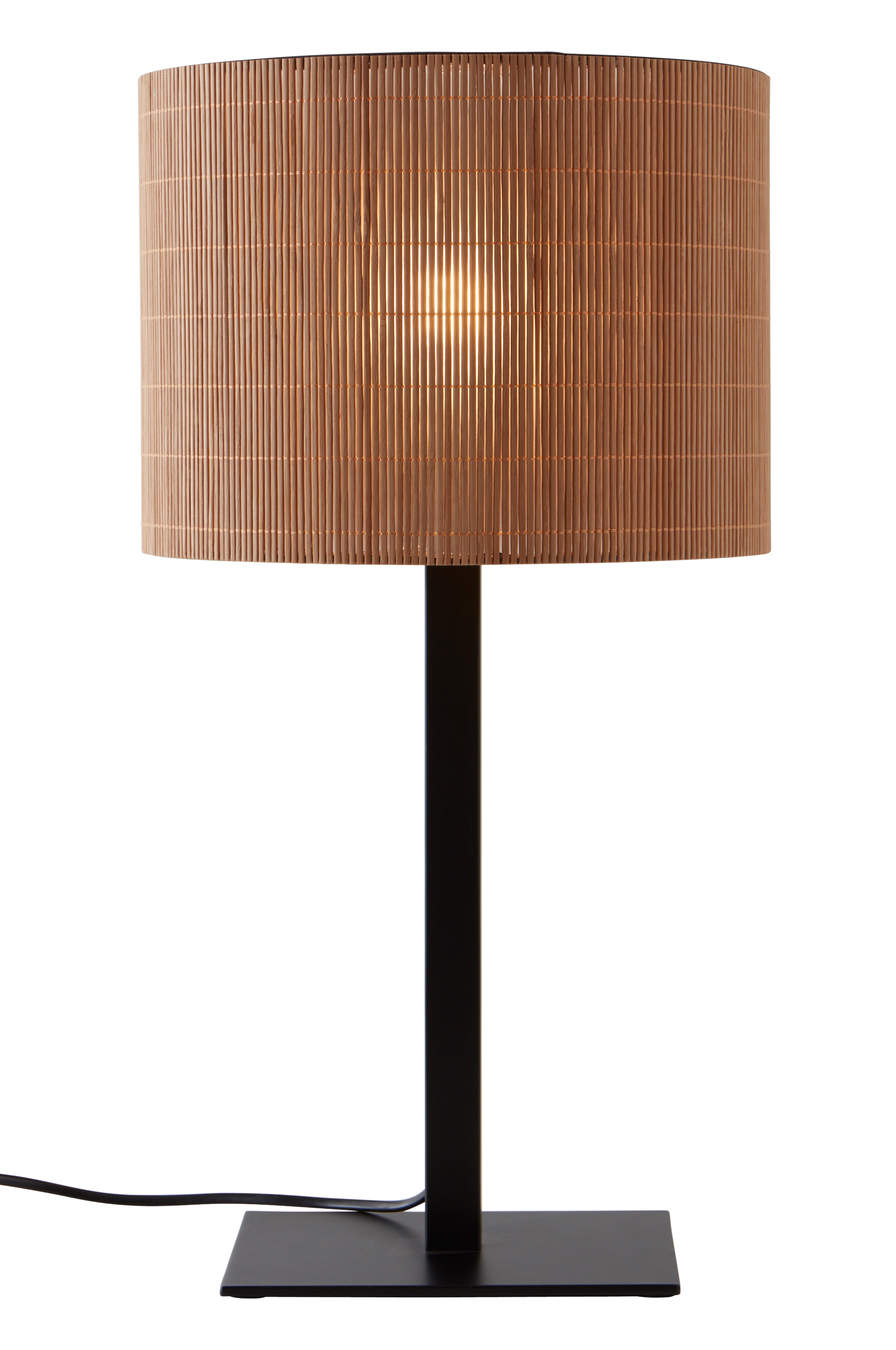 Bordlampe med skjerm av naturlige bambusstrå og fot av metall med matt overflate. Bambustråene er fôret med frostet laminat som gir fint og hjemmekoselig lys, stammen i skjermen er av metall. Lampefoten har firkantet profil, også foten nederst er firkantet. Det kantete gir en fin kontrast til den naturlige og livlige bambusen. Svart plastkledd ledning med bryter på ledningen.