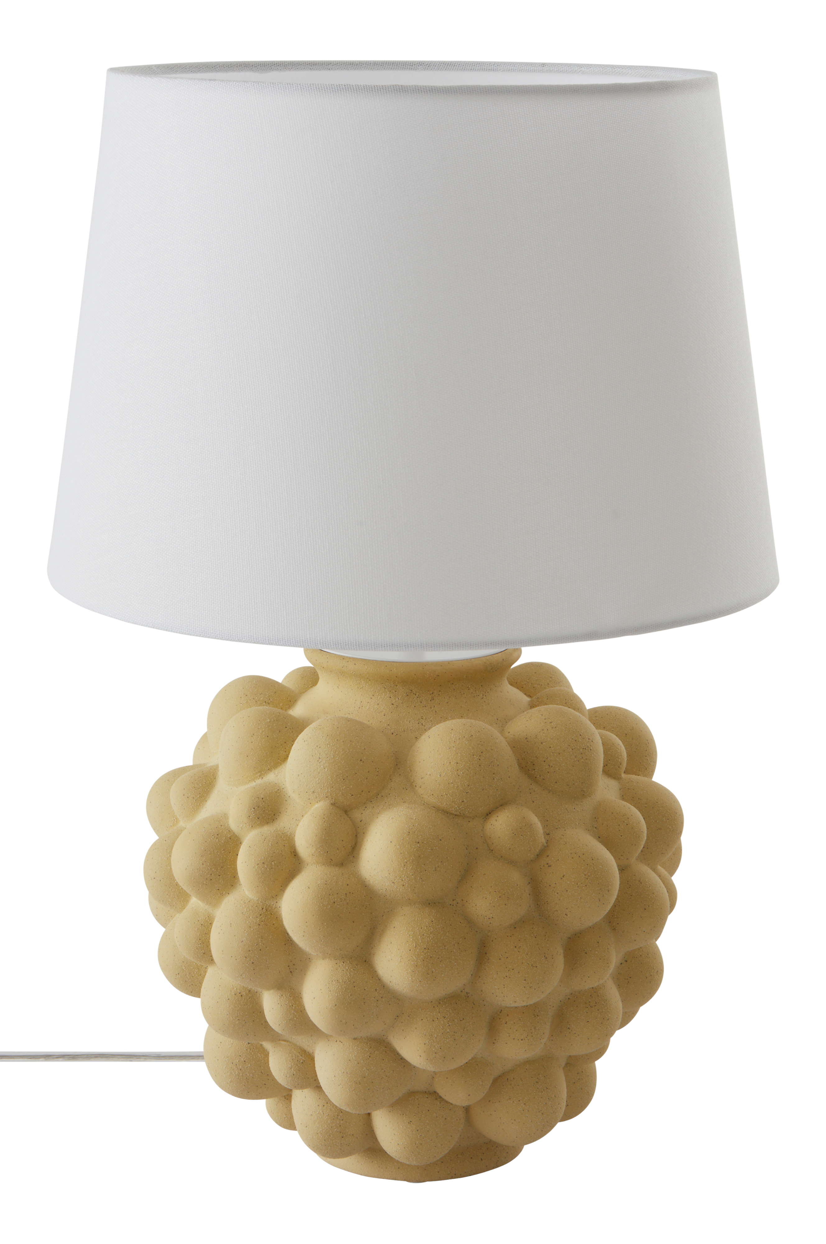 Bordlampe med effektfull lampefot av keramikk i herlig boblete design kombinert med stilren lampeskjerm av lin. Herlig kontrast oppstår og resulterer i en svært lekker bordlampe. Stammen i lampeskjermen er av jern. Strømbryteren er plassert på ledningen.