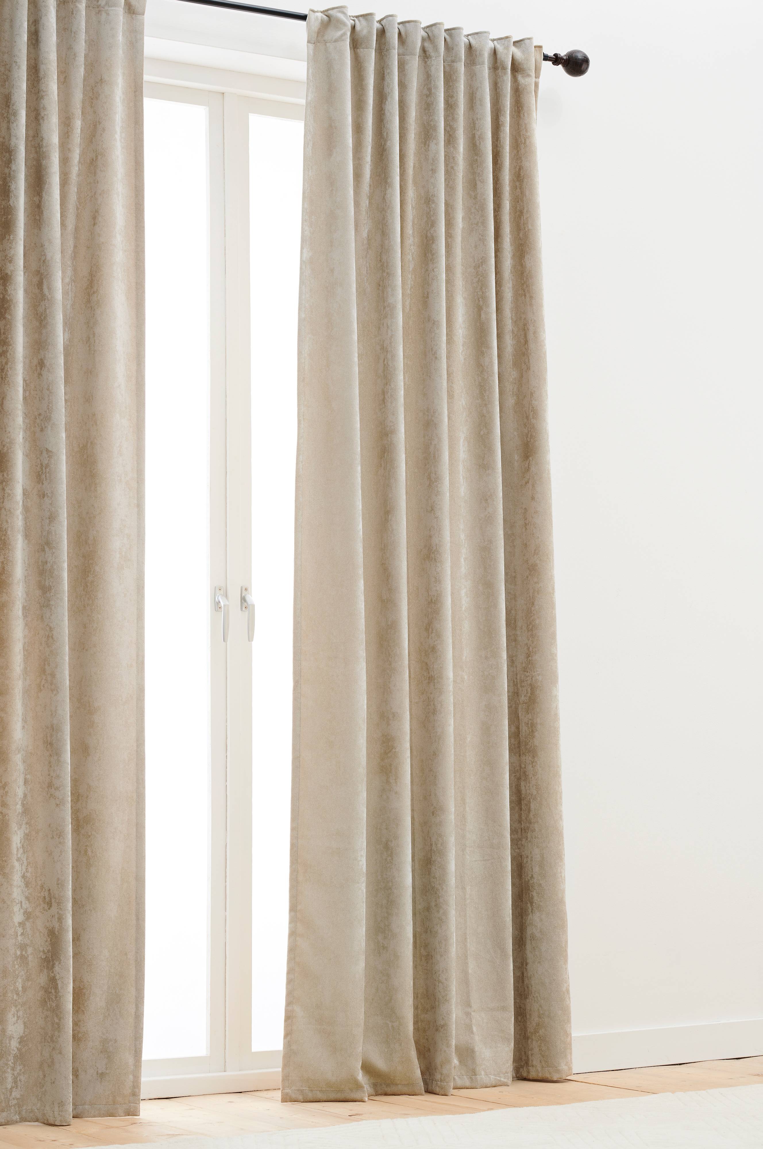 2-pk ensfarget gardinlengder i polyesterblanding med påsydd multifunksjonsbånd. Gardinen kan henges opp med fingerkroker, løpegang eller skjult hempe.