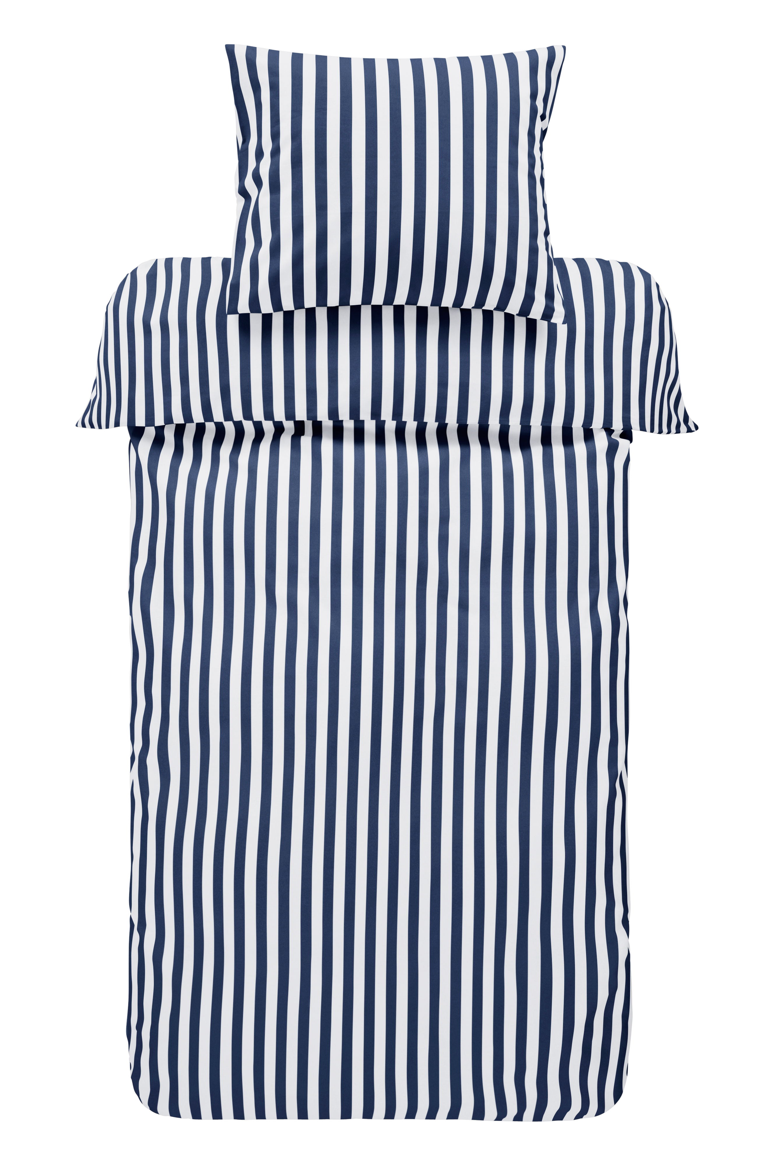 Smalstripete sengesett med et dynetrekk og et putevar i økologisk bomull. De klassiske stripene fungerer like fint til liten som stor. Stoffet har et behagelig trykk, og bomull er sval og deilig mot huden. Det er vanskelig å slå følelsen av å krype opp i en nyoppredd seng. Stripemønsteret er trykt i klare, glade farger blandet med annenhver stripe i hvitt. Åpning øverst i hjørnene på dynetrekket. Det gjør det lettere å tre dynetrekket over dynen. Trådtetthet på 144 tc. (Trådtettheten forteller om antallet tråder, thread counts, pr. kvadrattomme i et stoff. Jo høyere trådtetthet, desto høyere kvalitet.)