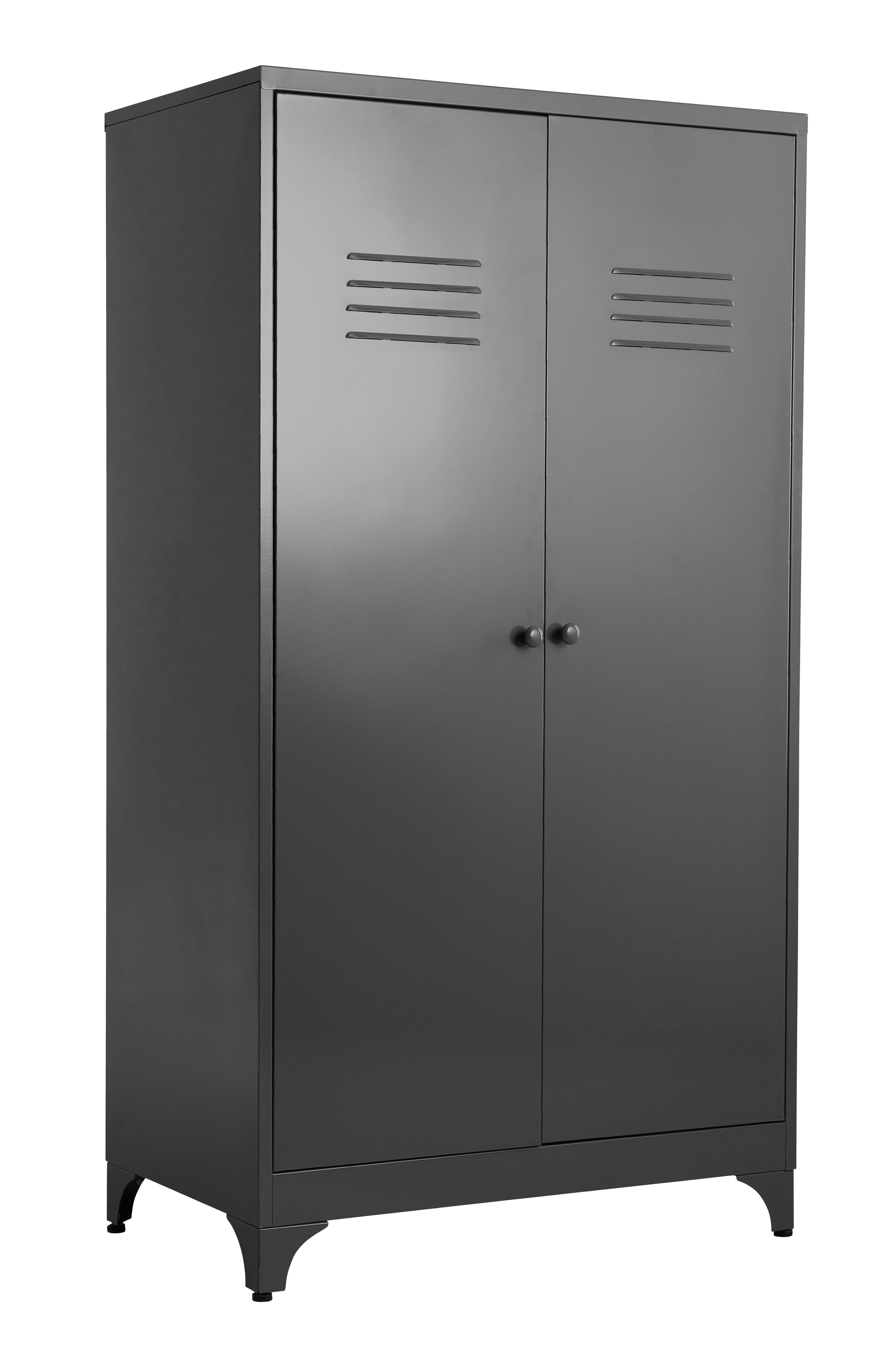 Garderobeskap i pulverlakkert stål med en klesstang øverst og to flyttbare hyller. Tøft garderobeskap som gir rommet en sporty følelse med innslag av nostalgi. Doble dører med klassiske luftinntak øverst og knotter for åpning. Fester for veggmontering medfølger. Leveres umontert. Monteringsanvisning medfølger.